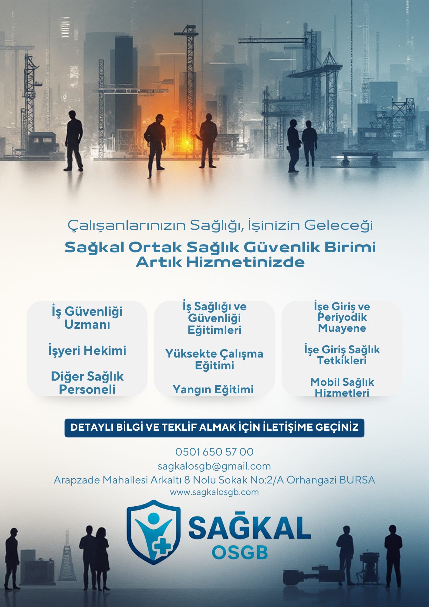 Deneyimli kadrosu ile Orhangazi ve bölgede ki işletmeler için OSGB anlamında tüm hizmetlerin sağlandığı SAĞKAL OSGB’nin irtibat ofisi ise Orhangazi’de Arapzade Mahallesi, Arkaltı Caddesi, ( Marmara Ekmek Fırını yanı ) adresinde.