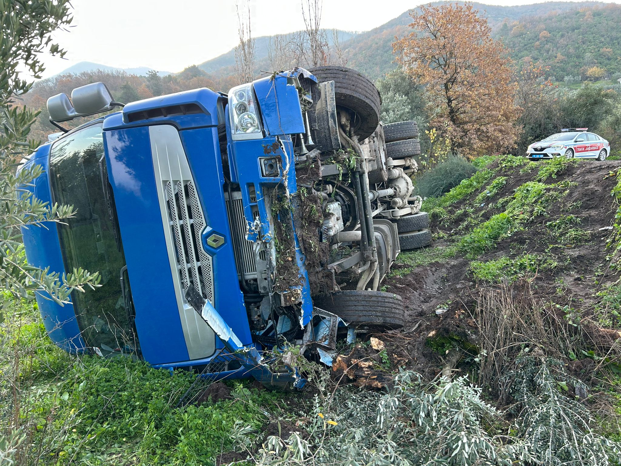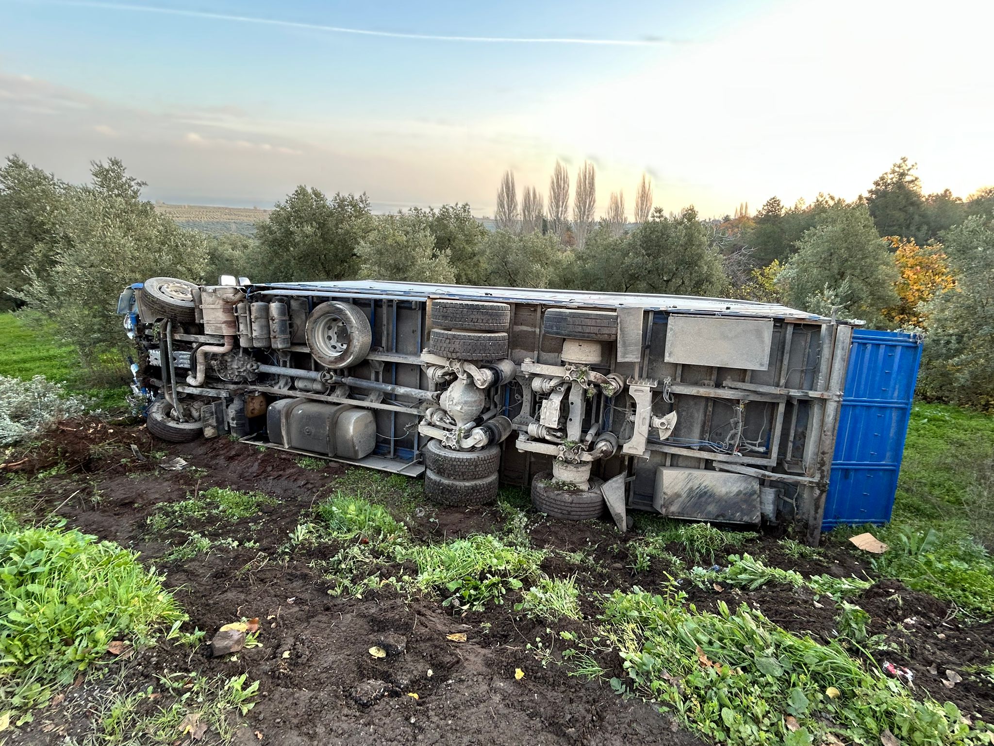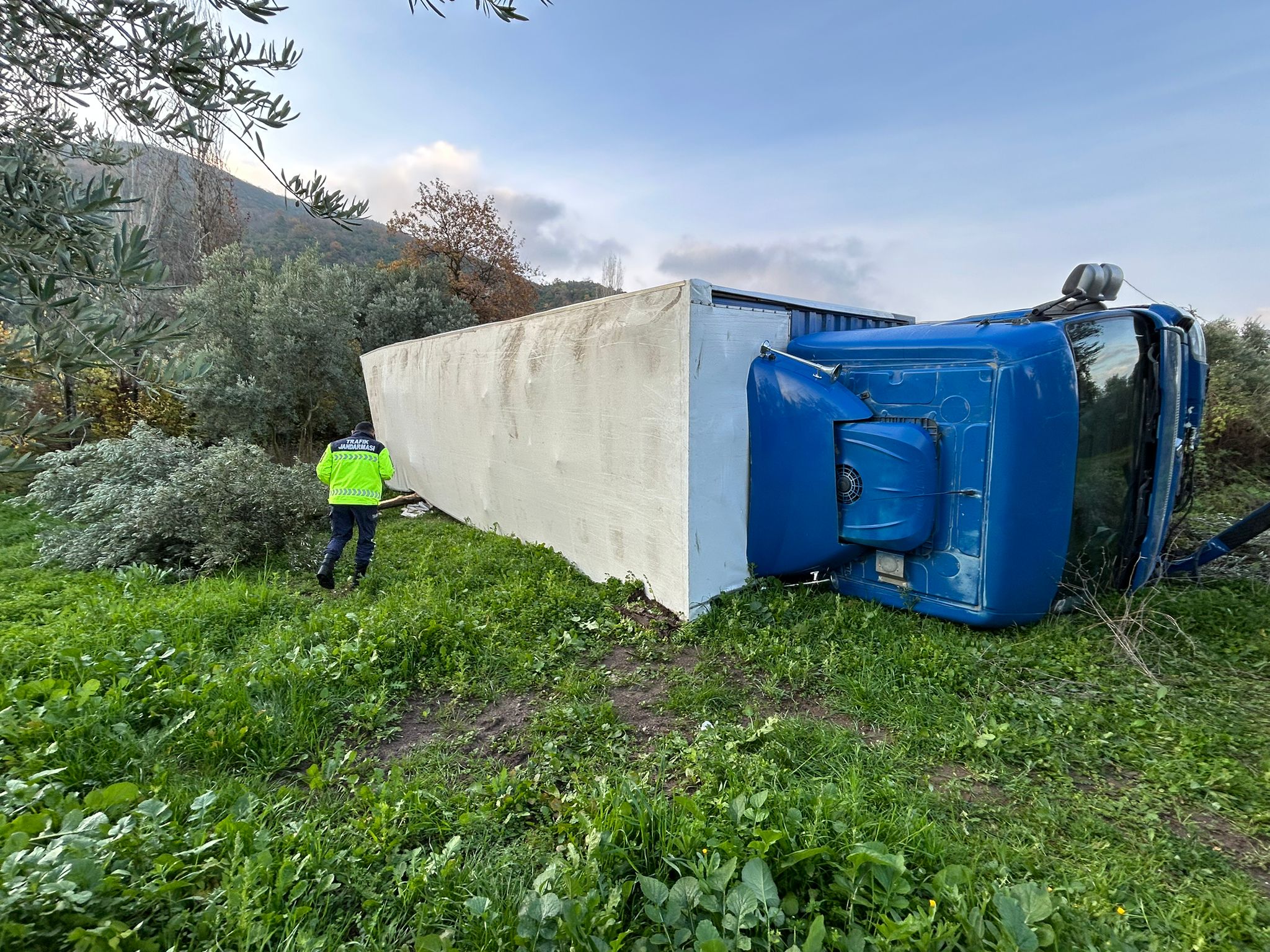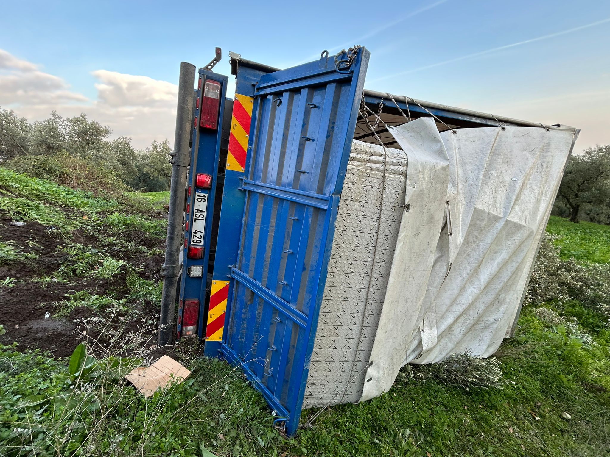 Kaza bugün ilçeye bağlı Bayırköy Mahallesi yakınlarında meydana geldi. Alınan bilgilere göre Orhangazi yönüne gitmekte olan mobilya yüklü kamyon virajda sürücünün direksiyon hakimiyetini kaybetmesi ile bir anda savrularak zeytin tarlasının içine devrildi.