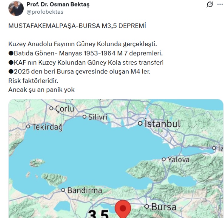 Bursa’nın Mustafakemalpaşa ilçesinde meydana gelen 3.5 büyüklüğündeki depremin ardından yer bilimci Prof. Dr. Osman Bektaş’tan değerlendirme geldi.