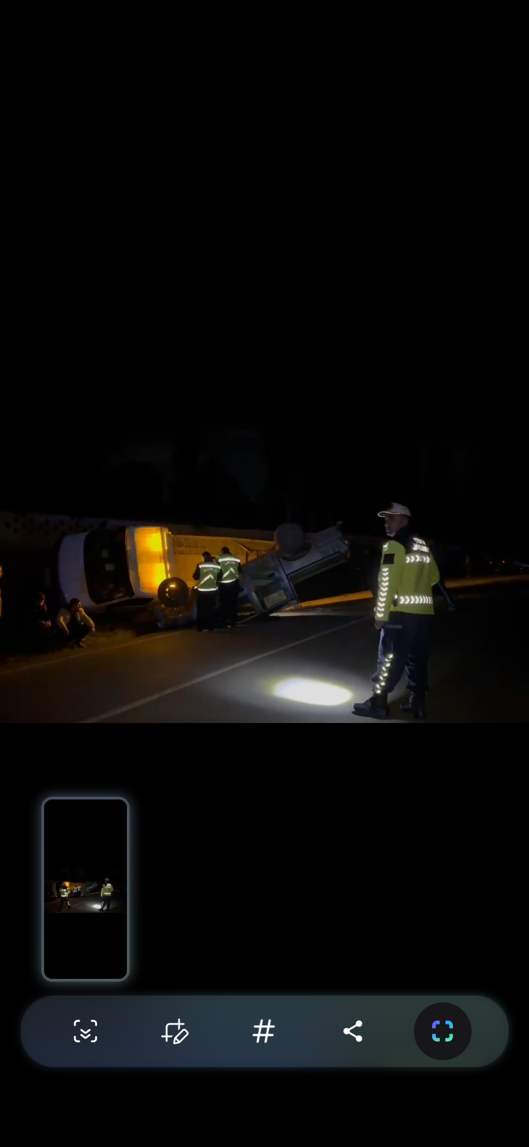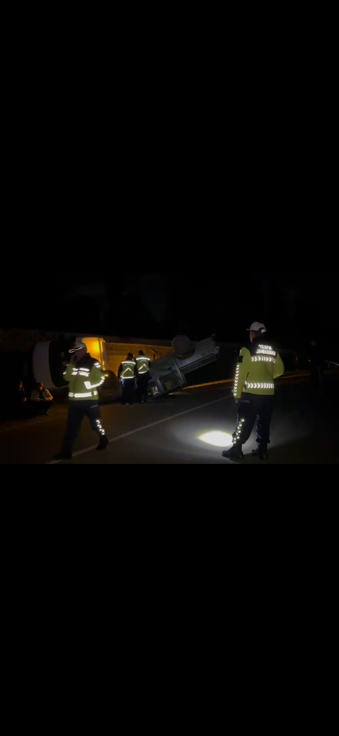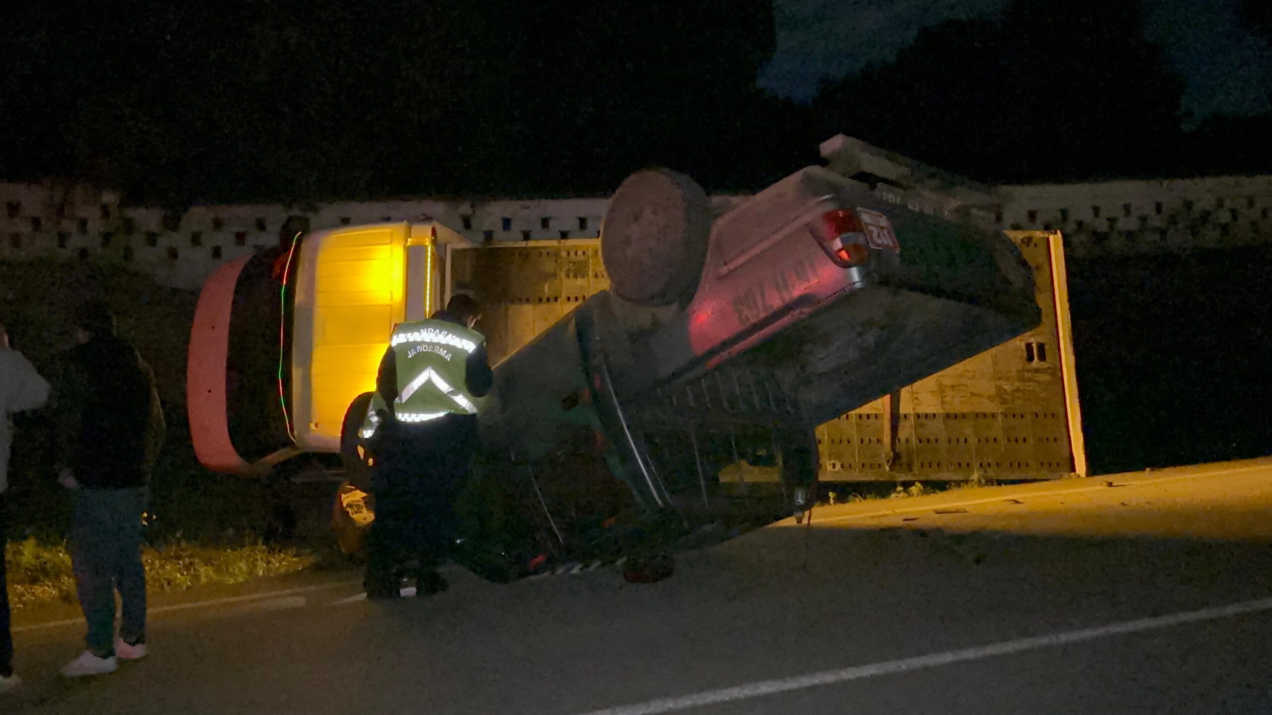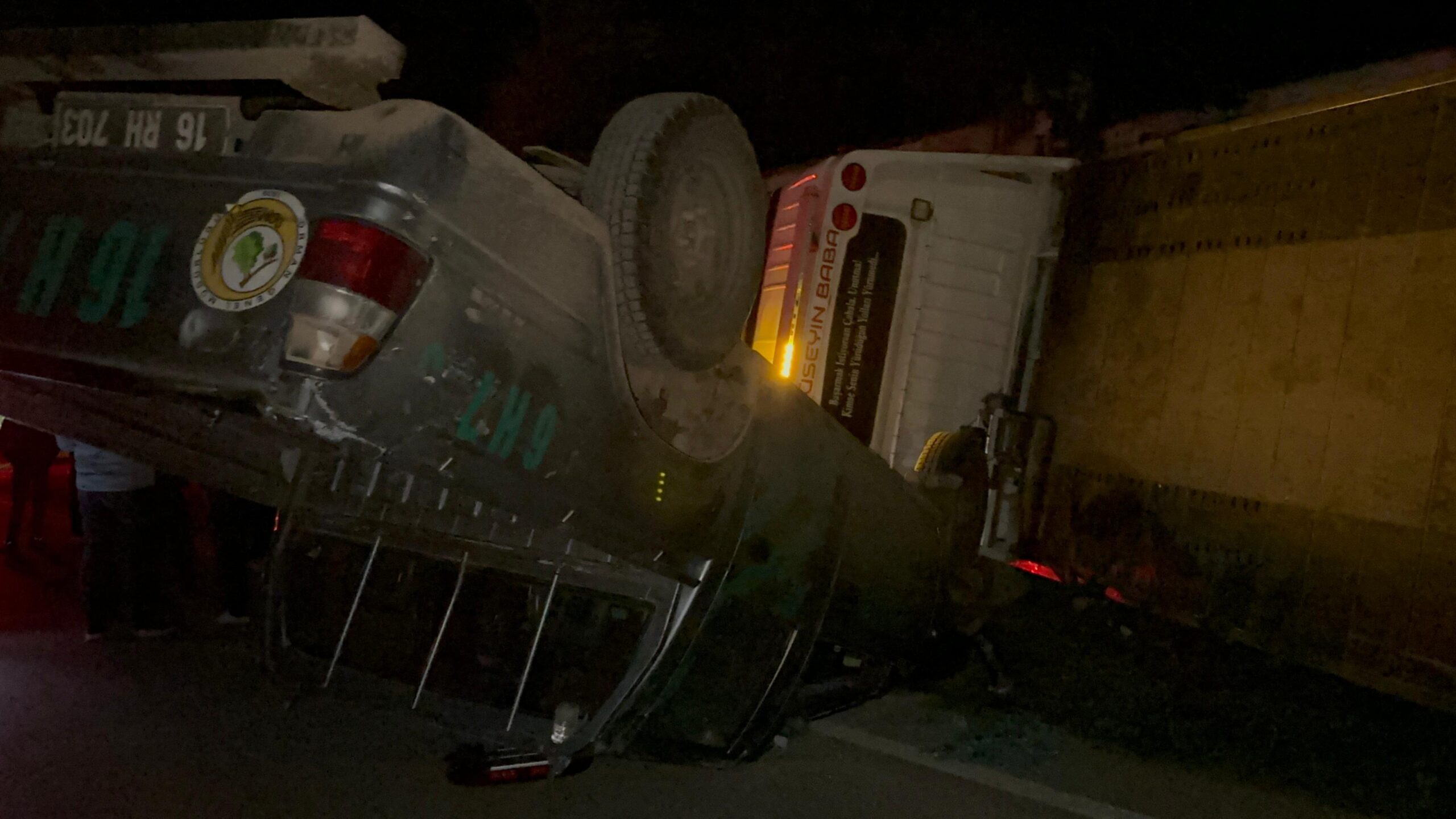 Kazada çekicide bulunan 3 kişi şans eseri yara almadan kurtulurken, yan yatan çekinin üzerinde bulunan Orman işletme şefliğine ait kamyonda yere düştü.