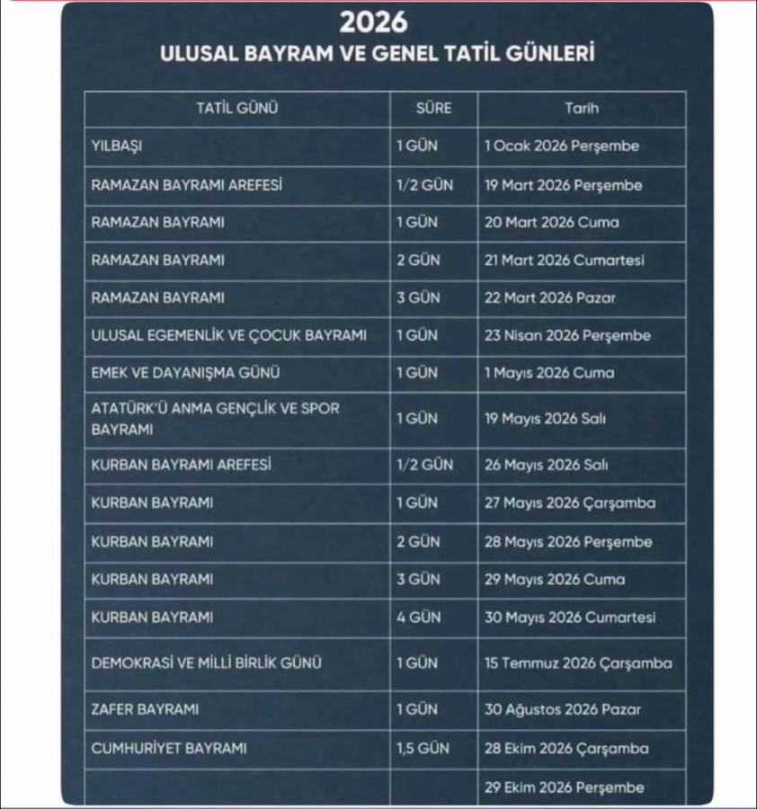 • 29 Ekim 2026 Perşembe (28 Ekim yarım gün): Cumhuriyet Bayramı