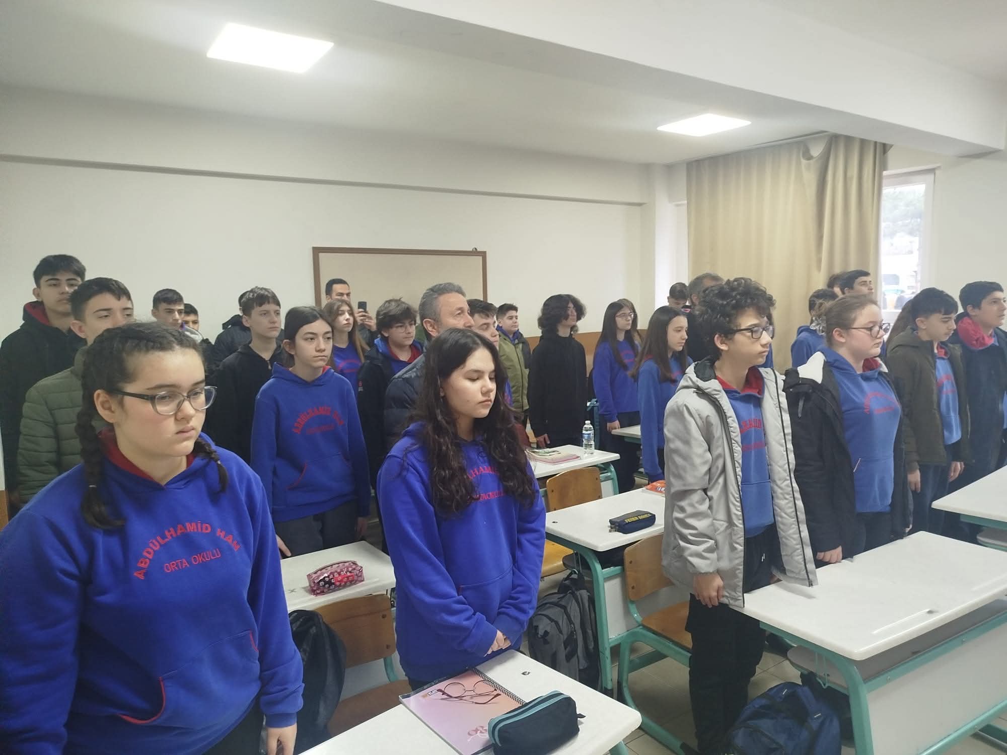 Orhangazi ilçesinde de Anma programına katılan İlçe Millî Eğitim Müdürü Erol Şanlıtürk ile İlçe Millî Eğitim Şube Müdürü Cengiz Tosun, Abdulhamid Han Ortaokulunda öğrencilerle birlikte saygı duruşuna bulundu.