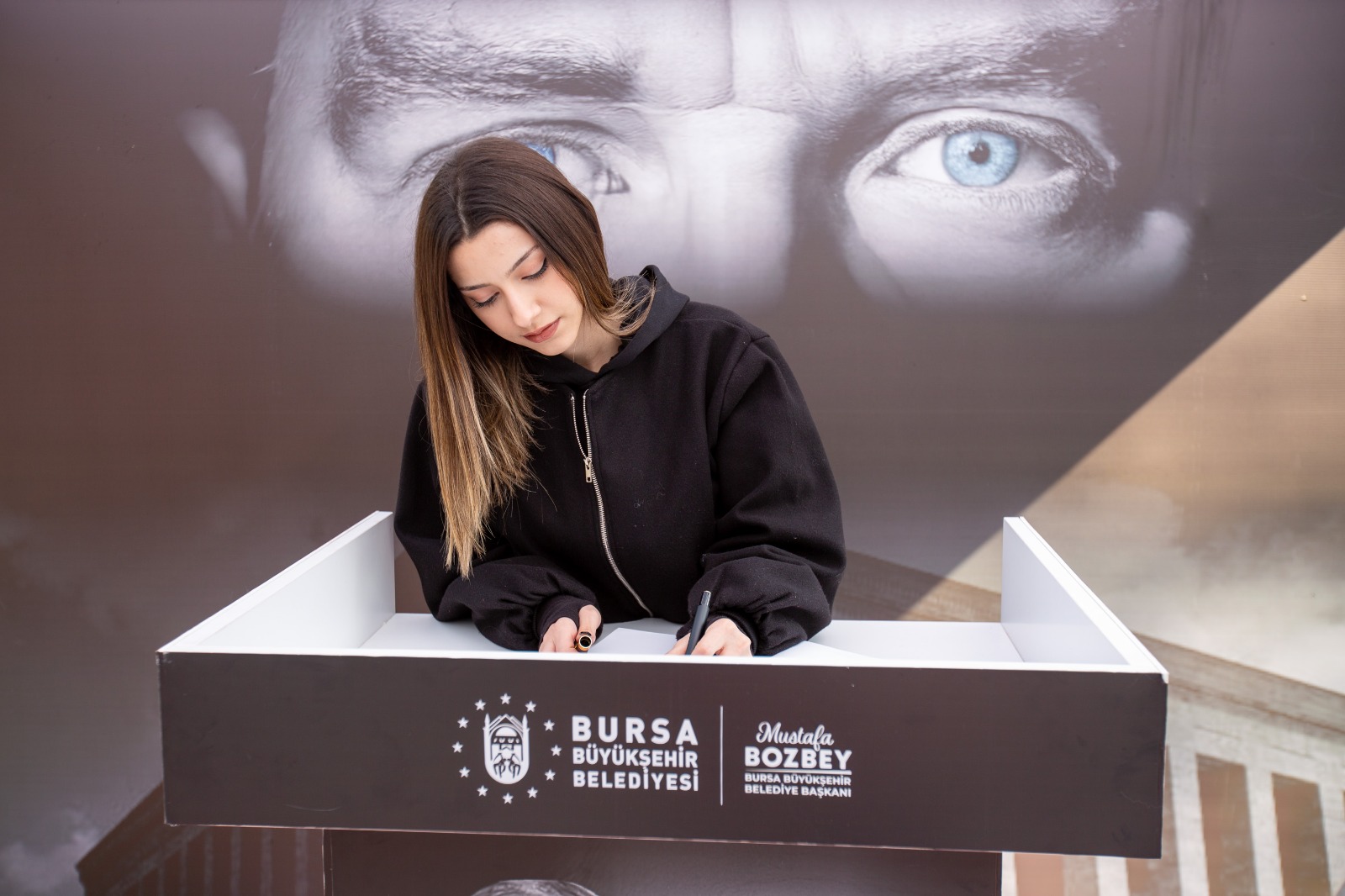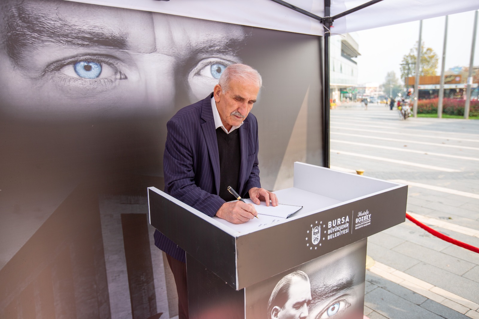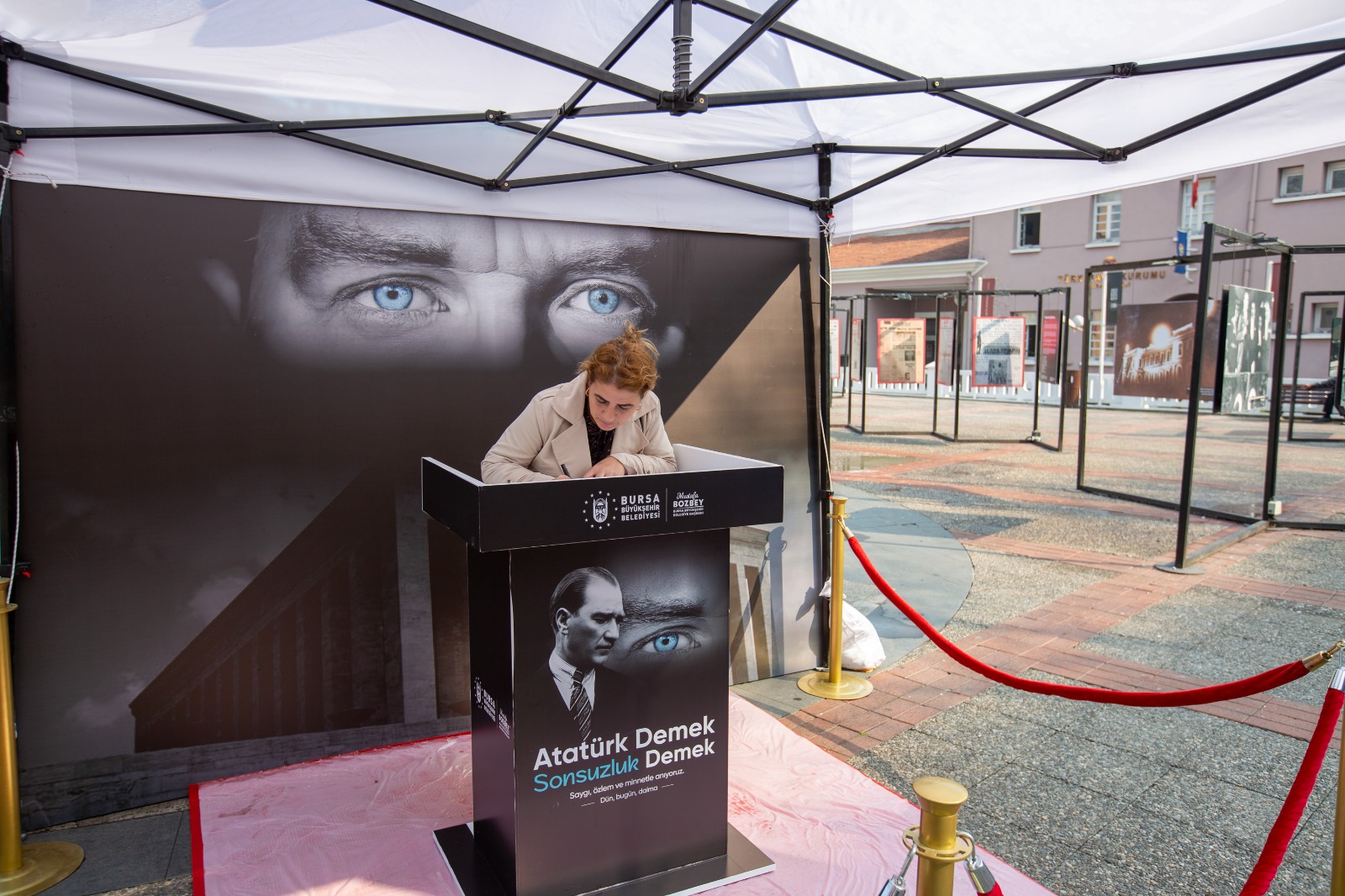 Cumhuriyetimizin kurucusu Ulu Önder Gazi Mustafa Kemal Atatürk’ün aramızdan ayrılışının 87. yıl dönümünde Bursa’da kalpler ve kalemler, Büyükşehir Belediyesi’nin projesi ile bir araya geliyor. Bursalılar, Ata’ya duydukları özlem ve sevgilerini Büyükşehir Belediyesi’nin kentin farklı noktalarına kurduğu anı defteri stantlarıyla satırlara döküyor.