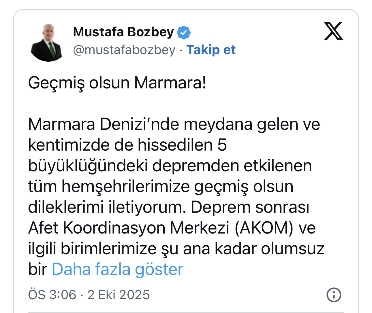 Geçmiş olsun Marmara! Marmara Denizi’nde meydana gelen ve kentimizde de hissedilen 5 büyüklüğündeki depremden etkilenen tüm hemşehrilerimize geçmiş olsun dileklerimi iletiyorum. Deprem sonrası Afet Koordinasyon Merkezi (AKOM) ve ilgili birimlerimize şu ana kadar olumsuz bir durum bildirilmemiştir.