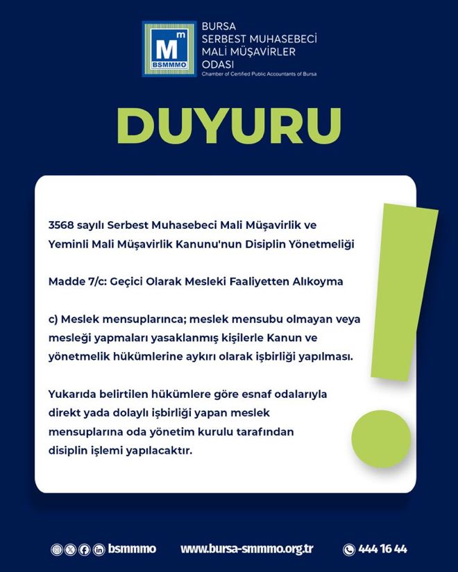 BSMMMO’nun duyurusuna göre, Yönetmeliğin Madde 7/c: Geçici Olarak Mesleki Faaliyetten Alıkoyma başlığı altında yer alan kritik bir ihlal maddesi vurgulanırken yapılan açıklamada,  meslek onurunun ve yasal sınırların korunması adına, tüm Serbest Muhasebeci Mali Müşavirlerin ve Yeminli Mali Müşavirlerin bu kurala titizlikle uymaları gerektiğini hatırlattı.