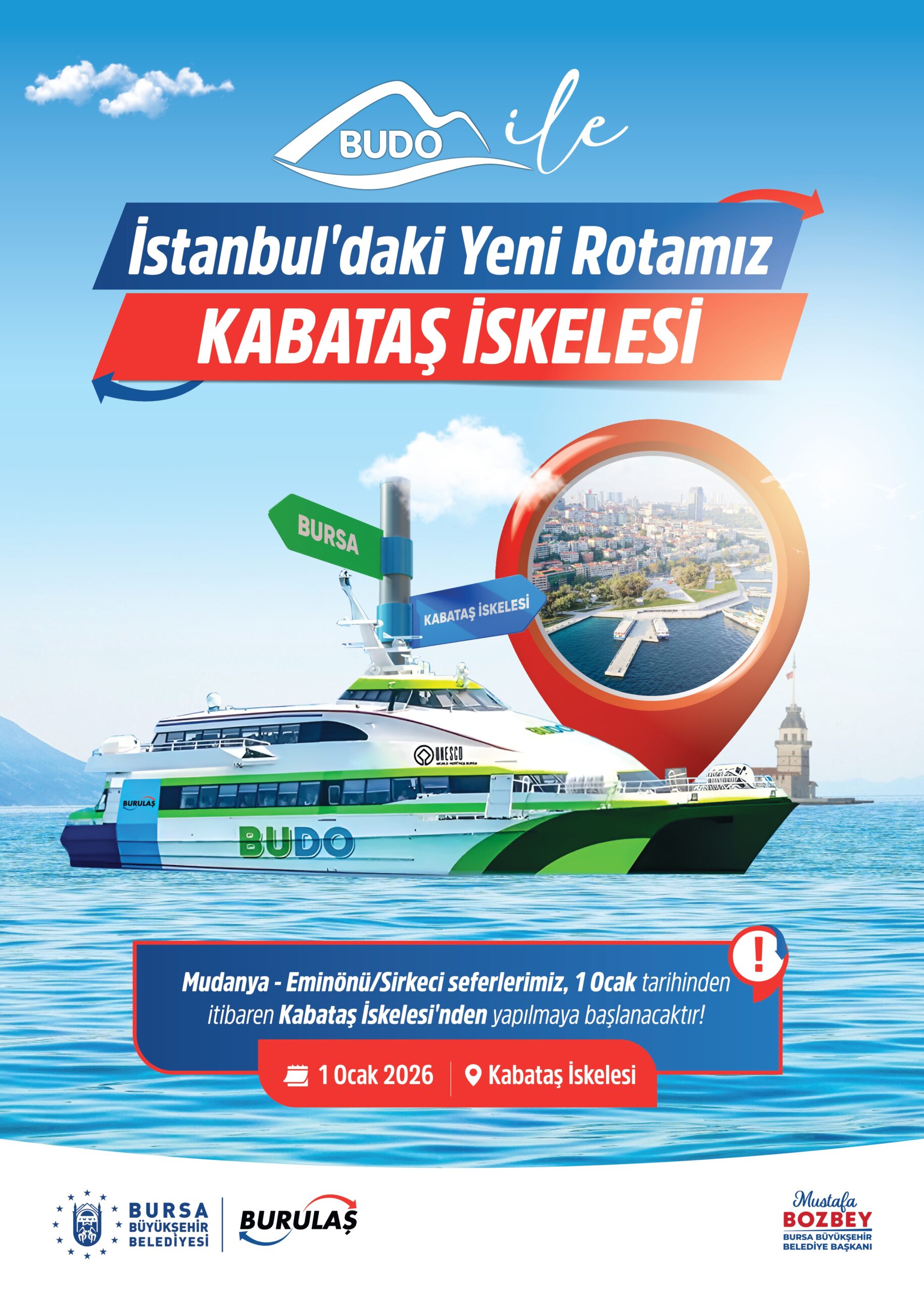 Bursa’nın sahil kenti özelliğini öne çıkarmak ve turizmden hak ettiği payı alabilmesini sağlamak amacıyla çalışmalarını sürdüren Bursa Büyükşehir Belediyesi, deniz ulaşımında yolcu konforunu ve kent içi ulaşım entegrasyonunu artırmaya yönelik gerekli adımları atıyor. Bu kapsamda BURULAŞ Genel Müdürlüğü tarafından işletilen BUDO’nun İstanbul seferlerinde önemli bir değişikliğe gidildi. Mudanya-Eminönü-Sirkeci hattında hizmet veren seferlerin İstanbul yanaşma noktası, 1 Ocak 2026 tarihinden itibaren Kabataş Transfer Merkezi olarak değiştiriliyor.