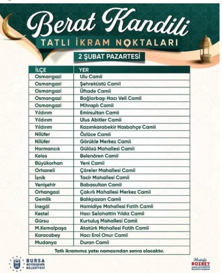 Paylaşılan listeye göre Osmangazi, Yıldırım, Nilüfer başta olmak üzere Bursa’nın merkez ve ilçelerinde çok sayıda cami tatlı ikram noktası olarak belirlendi. Vatandaşların kandil coşkusunu paylaşması amacıyla düzenlenen ikramlar, namaz çıkışında yapılacak.