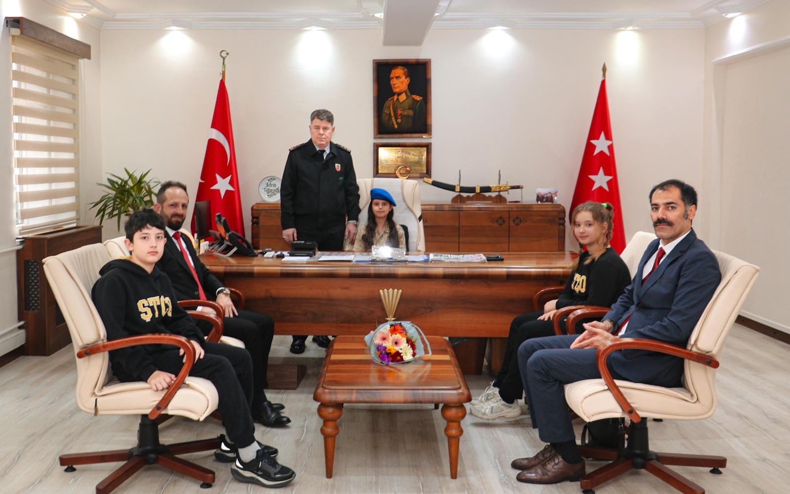 Ziyaret sırasında öğrencilerle yakından ilgilenen ve onlarla sohbet eden Tümgeneral Tataroğlu, jandarmanın yürüttüğü çalışmalar hakkında minik misafirlerine bilgi verdi. Makamı devralan öğrencilerin heyecanı gözlerinden okunurken, jandarma personeli de çocukların bayram coşkusuna eşlik etti.