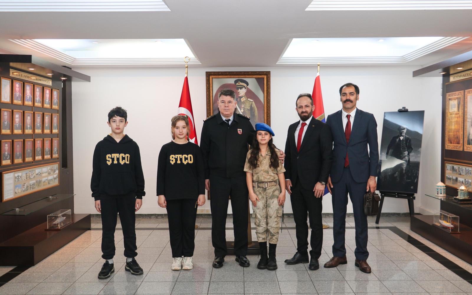 Gazi Mustafa Kemal Atatürk’ün çocuklara armağan ettiği 23 Nisan Ulusal egemenlik ve çocuk bayramı kapsamında, Osmangazi Şehit Taner Çobanoğlu Ortaokulu öğrencileri İl Jandarma Komutanlığı’nı ziyaret etti. Tümgeneral İdris Tataroğlu tarafından karşılanan küçük komutanlar, temsili olarak makam koltuğuna oturdu.