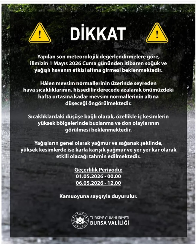 Bursa için yeni bir hava durumu uyarısı yayımlandı. Bursa Valiliği, 1 Mayıs’tan itibaren kent genelinde sıcaklıkların sert şekilde düşeceğini ve yağışlı havanın etkili olacağını duyurdu.