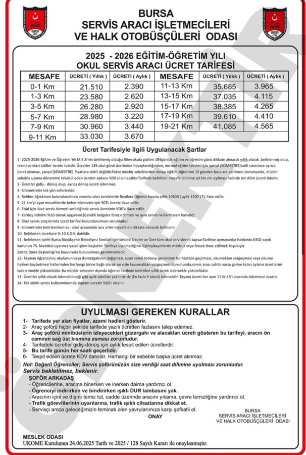 Bursa‘da 2026 eğitim ve öğretim yılına ilişkin okul servis aracı ücret tarifesi belli oldu. Bursa Servis Aracı İşletmecileri ve Bursa Halk Otobüsçüleri Odası tarafından hazırlanan yeni tarife, Bursa Büyükşehir Belediye Meclisi’nin 20 Ocak 2026 tarihli kararla onaylandı. 24 Haziran 2025 tarihinde 0-1 km servis ücreti yıllık 21 bin 519 TL iken 20 Ocak 2026 tarihinde onaylanan ücret ise 24 bin 750 TL oldu.