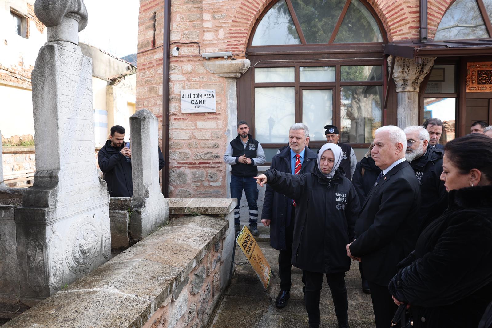 Bursa Büyükşehir Belediye Başkanı Mustafa Bozbey de Alaüddin Paşa Camii’ni ziyaret ederek çalışmaları yerinde inceledi. Günümüzden tam 700 yıl önce Bursa’nın fethinin ardından inşa edilen caminin Bursa tarihi açısından büyük önem taşıdığını söyleyen Başkan Mustafa Bozbey, “Gerçekleştirdiğimiz uygulamayla hazireyi olduğu gibi ortaya çıkardık. Arkadaşlarımız yoğun bir çalışma yürüttü. Alanda dönemin önemli insanlarının mezarları da bulunuyor. Hem büyüklerin hem de çocukların mezarları var. Bu kıymetli mezar taşları caminin haziresinde yeniden gün yüzüne çıkarıldı” dedi.