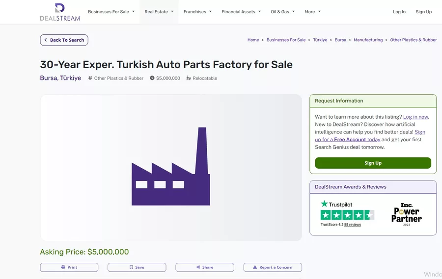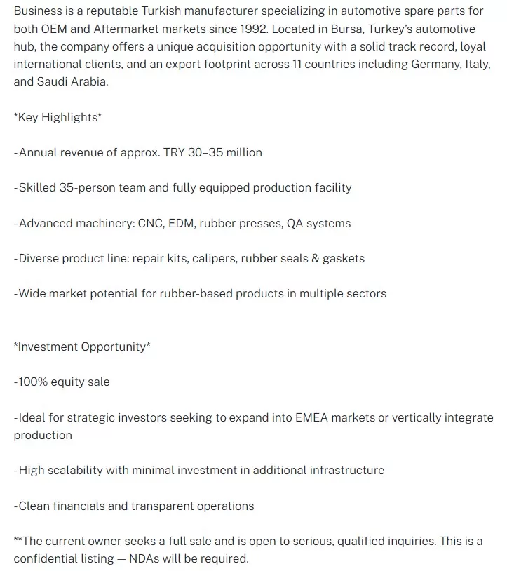 Dünyanın en büyük şirket alım-satım platformlarından biri olan Dealstream‘da yer alan ilanda, şirketin ismi “gizlilik sözleşmesi” gereği açıkça belirtilmedi. Ancak açık verilen detaylar, fabrika hakkında önemli ipuçları sundu. Kuruluş yılının 1992 olarak belirtildiği ilanda, fabrikanın satış bedeli 5 milyon dolar olarak belirlendi. Söz konusu şirketin, hem otomobil markalarına doğrudan parça sağlayan ‘OEM’ (Orijinal Ekipman Üretimi) yaptığı hem de dünya genelindeki servis ağları için ‘Aftermarket’ (Satış Sonrası Yedek Parça) üretimi gerçekleştirdiği belirtildi.