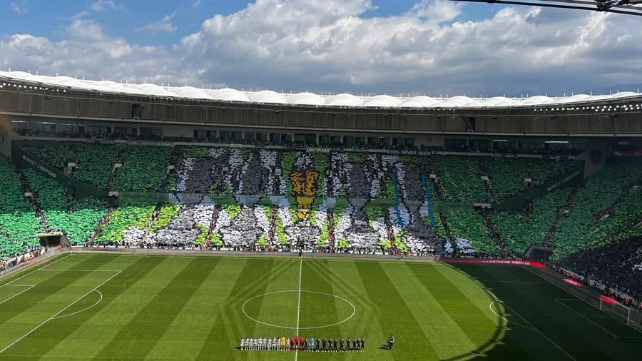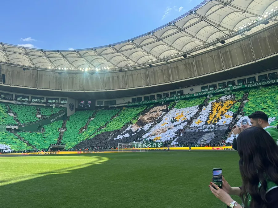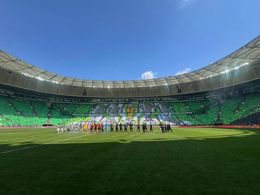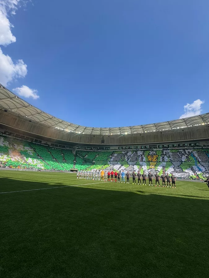 TFF 2. lig Kırmızı Grup 33. haftasında şampiyonluk adına kritik karşılaşmaya çıkan Bursaspor’a taraftarları, görsel şölenle destek verdi. Yeşil beyazlı taraftarlar, Atatürk Spor Kompleksi Matlı Stadyumu’nda oynanacak Somaspor karşılaşması öncesi ilk kez üç tribünle birlikte koreografi gerçekleştirdi.