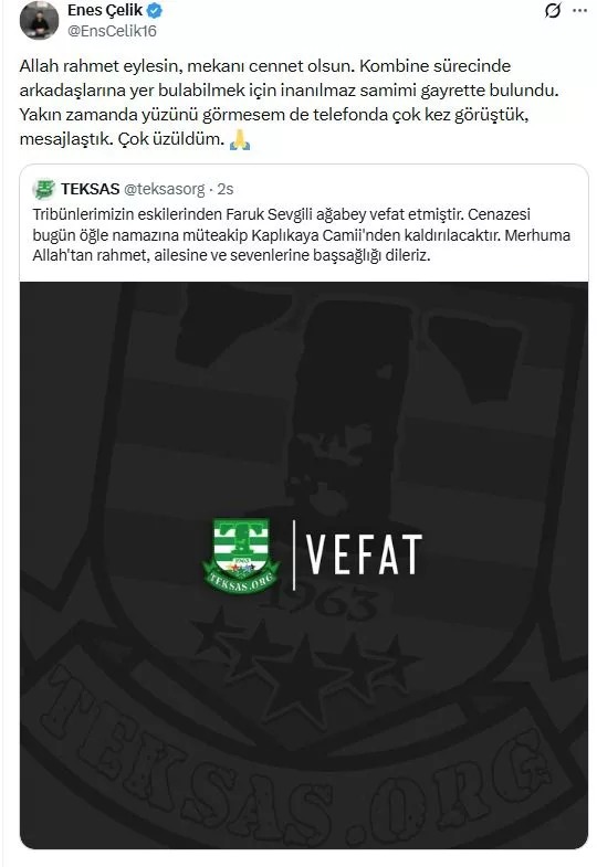 Bursaspor Başkanı Enes Çelik, acı haberin ardından bir taziye paylaşımında bulundu. Faruk Sevgili’nin kombine sürecinde büyük emek verdiğini vurgulayan Başkan Çelik, mesajında şu ifadelere yer verdi: