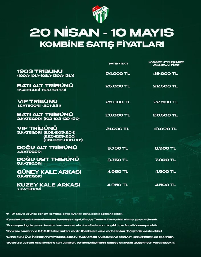 Kulüp ayrıca, kombine alacak taraftarların Bursaspor logolu Passo Taraftar Kart sahibi olması gerektiğini belirtirken, mevcut kart sahiplerinden yıllık vize ücreti alınmayacağını açıkladı. Kombine alımlarında taksit imkanı sunulurken, 11 Mayıs-31 Mayıs tarihinde başlayacak üçüncü döneme ilişkin fiyatların ise ilerleyen günlerde duyurulacağı bildirildi.