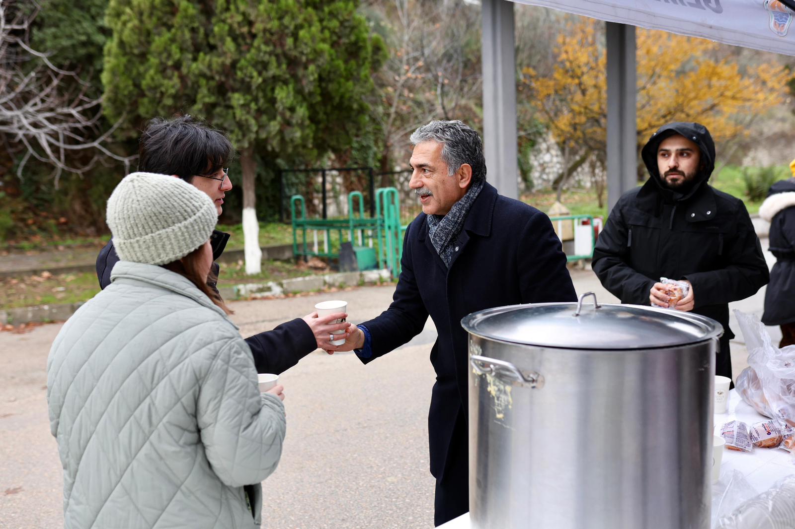 Final sınavlarının yoğun temposunda öğrencilere moral vermek ve küçük bir destek sunmak amacıyla gerçekleştirilen etkinlikte, sabah saatlerinden itibaren yüzlerce öğrenciye sıcak çorba dağıtıldı.