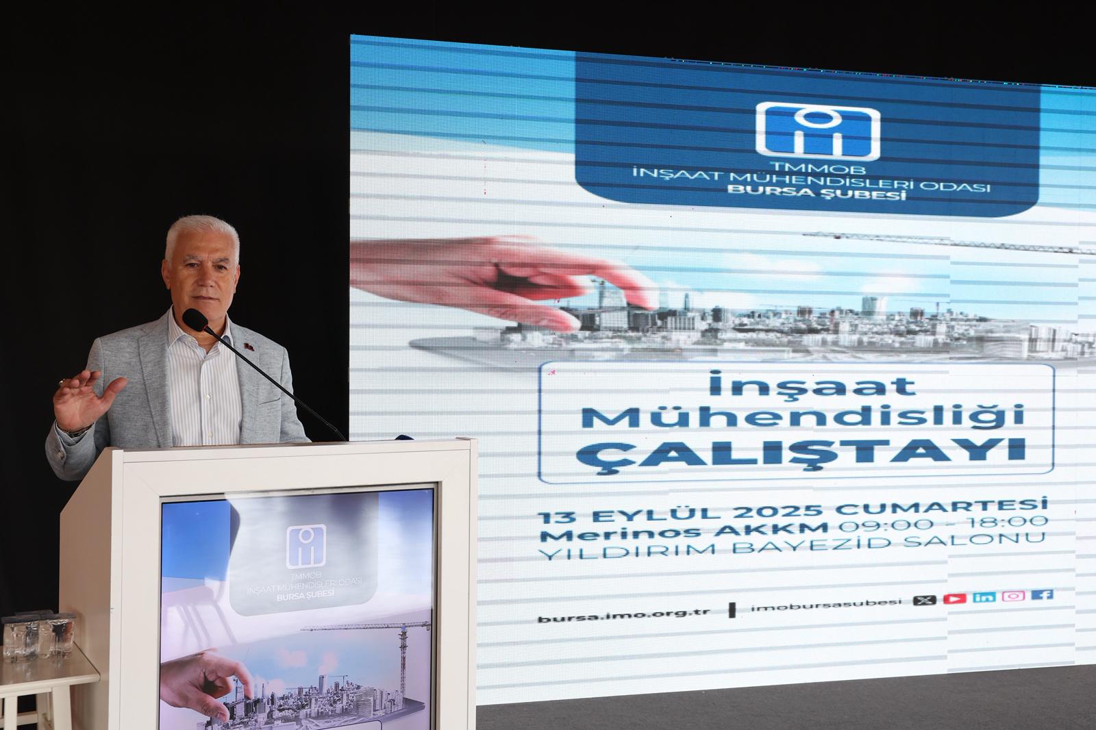 TMMOB İnşaat Mühendisleri Odası tarafından düzenlenen çalıştay programı, Atatürk Kültür Merkezi Merinos Yerleşkesi’nde yoğun katılımla gerçekleştirildi. İnşaat mühendisliği mesleğinin güncel sorunlarının, yeni projelerin ve çözüm önerilerinin konuşulduğu çalıştayda konuşan Büyükşehir Belediye Başkanı Mustafa Bozbey, Bursa’nın geleceğini inşa eden mühendislerin kent için taşıdığı önemi vurguladı. Bilimsel ve teknik verilere dayalı projelerin kentin sürdürülebilir gelişimine katkı sunacağını belirten Bozbey, “Bursa gibi tarihi ve kültürel mirası güçlü bir şehirde, mühendislerin ve mimarların desteği olmadan sağlıklı bir kentleşmeden bahsetmek mümkün değildir. Bursa Büyükşehir Belediyesi olarak hedefimiz daha güvenli, daha yeşil, daha yaşanabilir bir Bursa. Bunun için projeler geliştiriyor, çalışıyoruz. Çalıştayın verimli, ufuk açıcı ve birleştirici sonuçlar üretmesini diliyorum” diye konuştu.