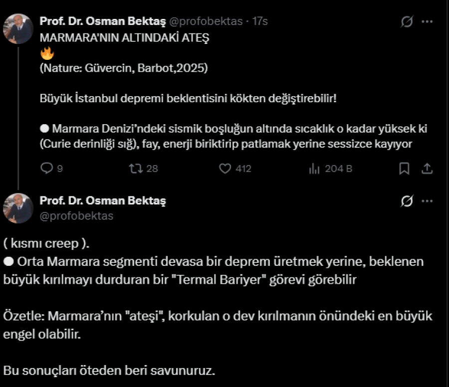 Paylaşımında Marmara Denizi’nin oluşum sürecine değinen Bektaş, yerin sıcak manto bölümünün yükselerek üstteki kabuğu ısıttığını, gerdiğini ve incelttiğini ifade etti. Bu sürecin Marmara Denizi’nin bugünkü yapısını şekillendirdiğini belirtti.