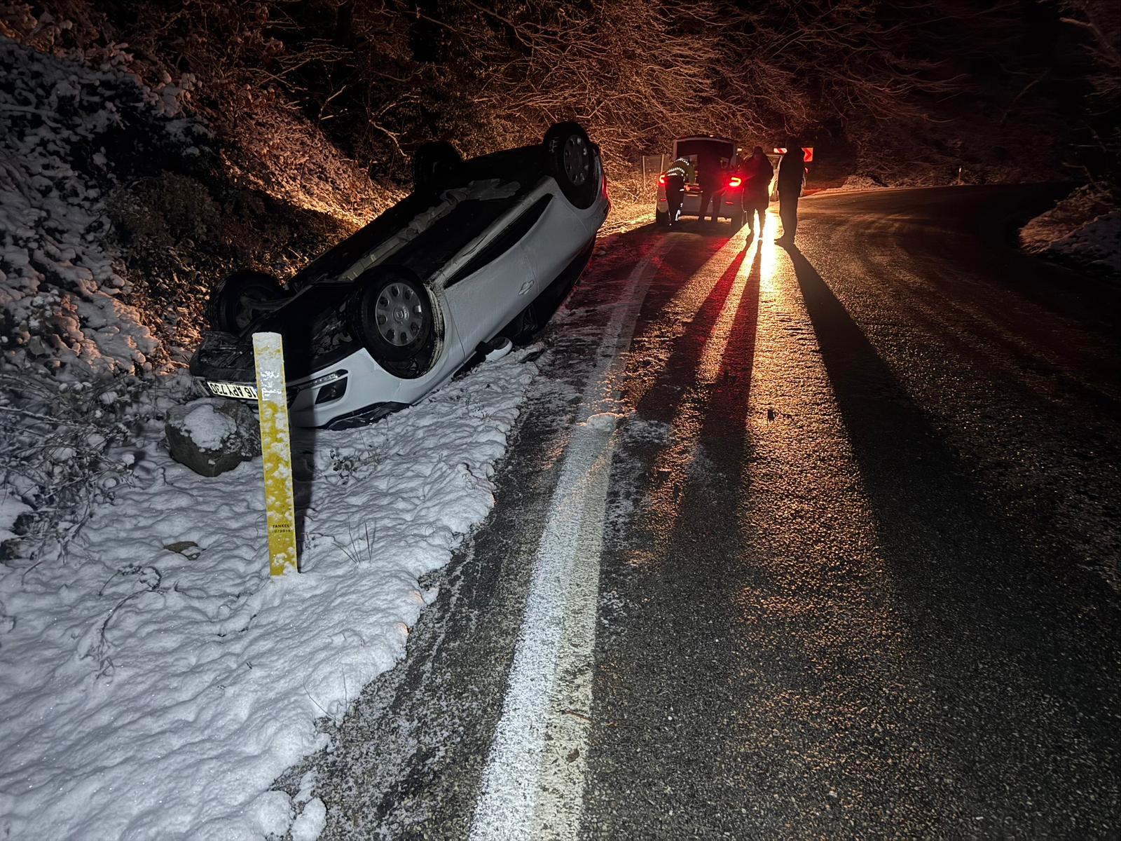 Bayırköy’den Orhangazi yönüne gitmekte olan otomobil,yokuş aşağı kar yağışı nedeniyle buzlanan yolda sürücünün direksiyon hakimiyetini kaybetmesiyle kontrolden çıkarak savruldu ve bir süre sonra takla atarak durabildi.