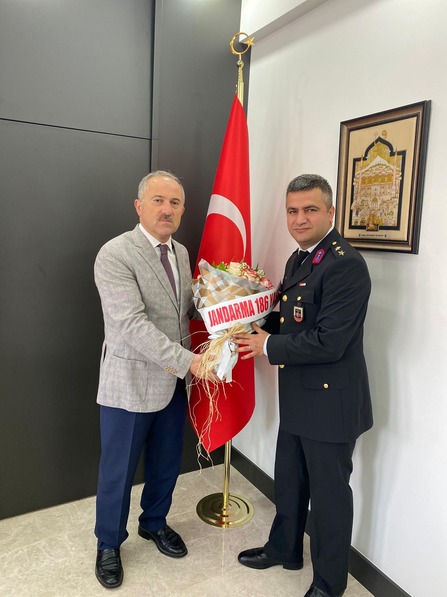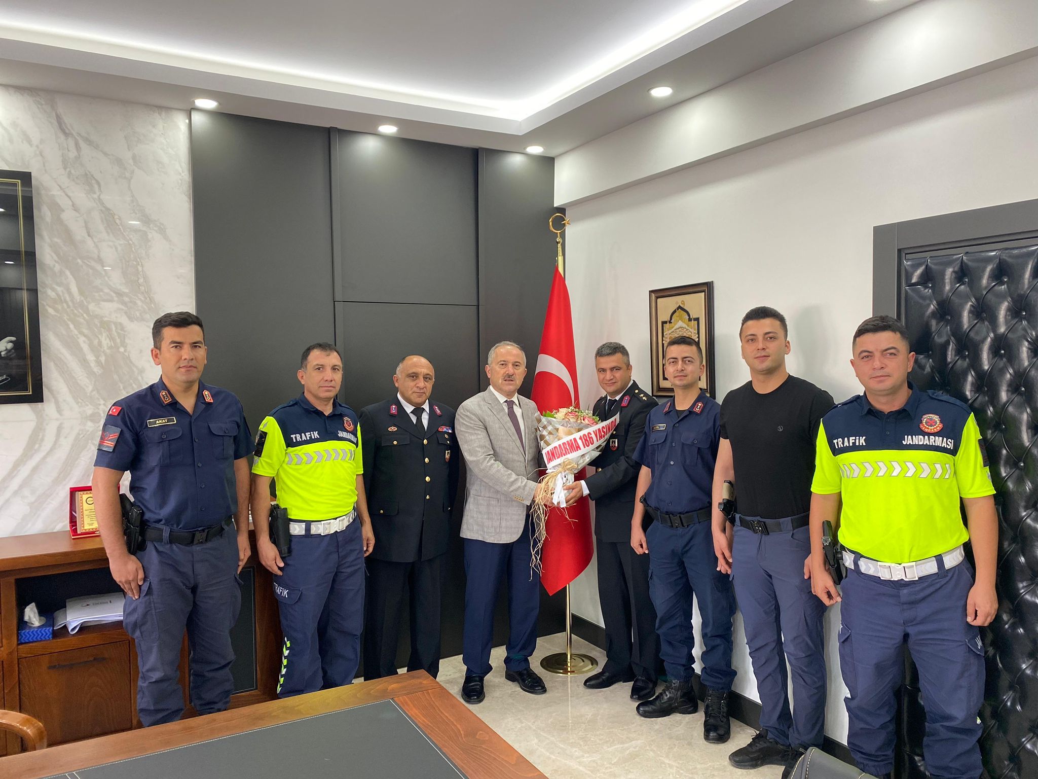 Jandarma teşkilatının 186. kuruluş yıl dönümü yapılan çeşitli program ve törenler ile kutlanırken, Orhangazi’de ilçe Jandarma komutanı Ütğm. Selim Kurtoğlu ile görevli diğer personeller Orhangazi Kaymakamı Zafer Karamehmetoğlu’na bir ziyaret gerçekleştirdiler.