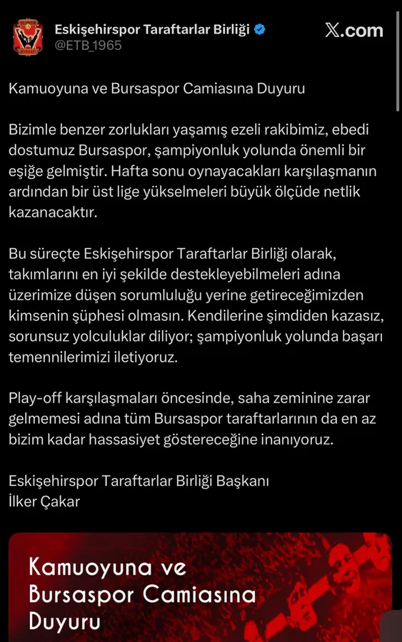 Eskişehirspor Taraftarlar Birliği Başkanı İlker Çakar, Bursaspor’un şampiyonluk yolunda önemli bir eşiğe geldiği vurgulanarak, iki kulüp arasındaki dostluk bağlarına dikkat çekti. Çakar, “Bizimle benzer zorlukları yaşamış ezeli rakibimiz, ebedi dostumuz Bursaspor, şampiyonluk yolunda önemli bir eşiğe gelmiştir. Hafta sonu oynayacakları karşılaşmanın ardından bir üst lige yükselmeleri büyük ölçüde netlik kazanacaktır. Bu süreçte Eskişehirspor Taraftarlar Birliği olarak, takımlarını en iyi şekilde destekleyebilmeleri adına üzerimize düşen sorumluluğu yerine getireceğimizden kimsenin şüphesi olmasın. Kendilerine şimdiden kazasız, sorunsuz yolculuklar diliyor; şampiyonluk yolunda başarı temennilerimizi iletiyoruz. Play-off karşılaşmaları öncesinde, saha zeminine zarar gelmemesi adına tüm Bursaspor taraftarlarının da en az bizim kadar hassasiyet göstereceğine inanıyoruz” ifadelerini kullandı.