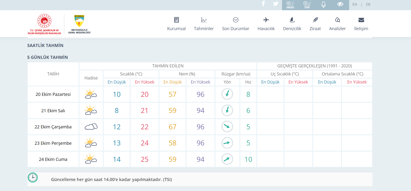 - 23 Ekim Perşembe : En düşük sıcaklık 13°C, en yüksek sıcaklık 24°C ile haftanın en sıcak günü olması bekleniyor.Nem oranı %58-96 aralığında seyrederken, rüzgar hızı 5 km/sa olacak ve parçalı bulutlu bir hava bekleniyor.