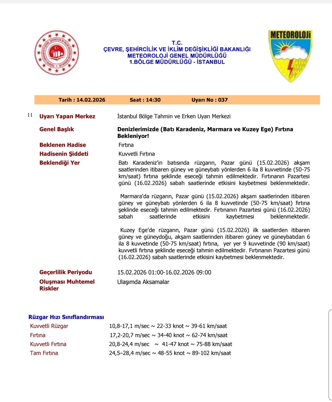 Fırtınanın hızının yer yer 50-75 km/saat (6 ila 8 kuvvetinde) bulacağı öngörülürken, etkisinin pazartesi günü sabah saatlerine kadar süreceği belirtildi.