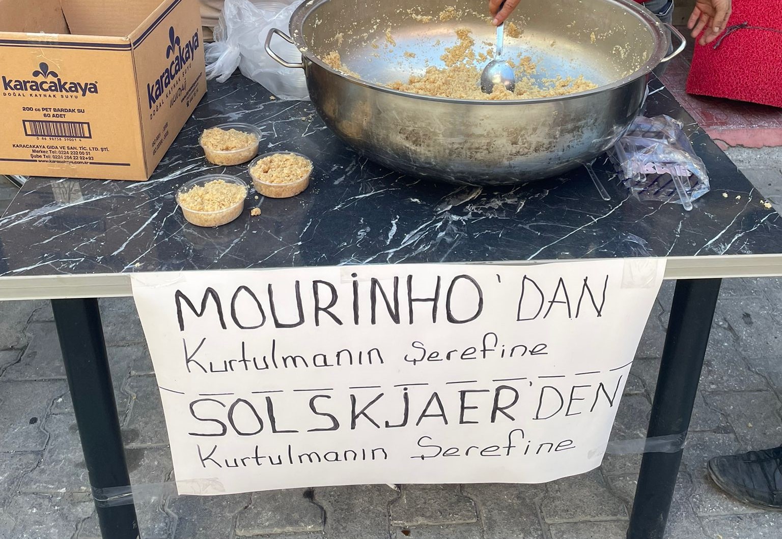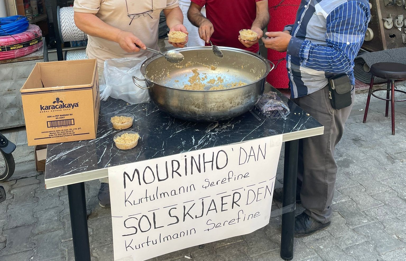Bursa’da İznik ilçe merkezinde bir araya gelen taraftarlar ise, kurdukları helva kazanının önüne “Mourinho’dan ve Solskjaer’den kurtulmanın şerefine” yazılı bir pankart astılar. Yoldan geçen vatandaşlara sıcak helva ikram ettiler.
