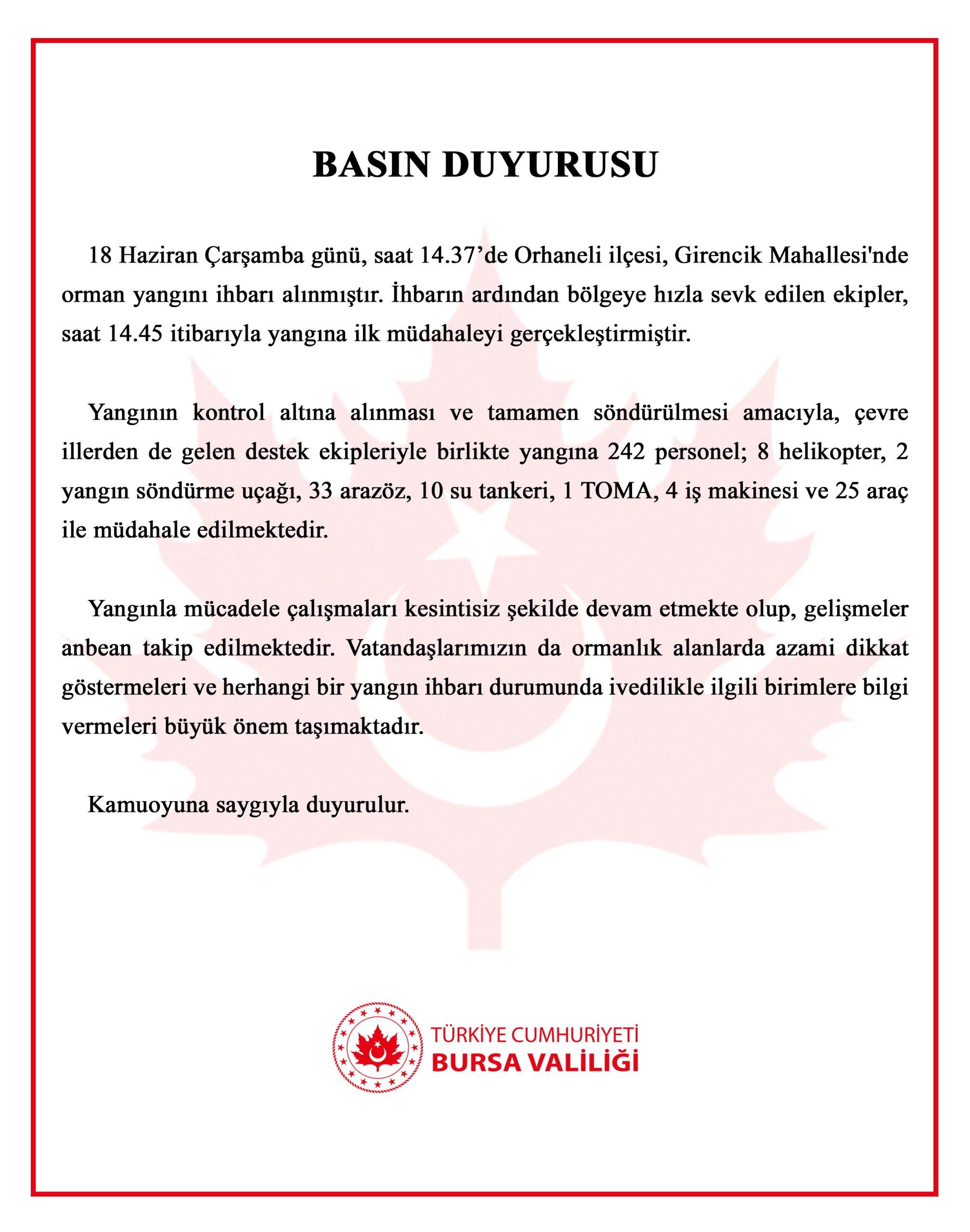 Bursa Valiliği, Orhaneli ilçesinde bugün çıkan orman yangını ile ilgili