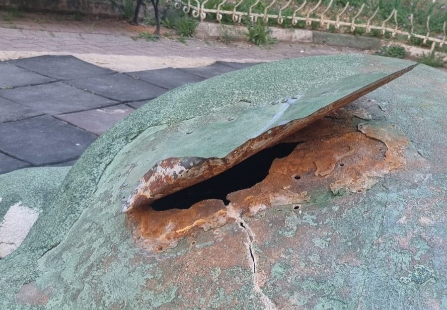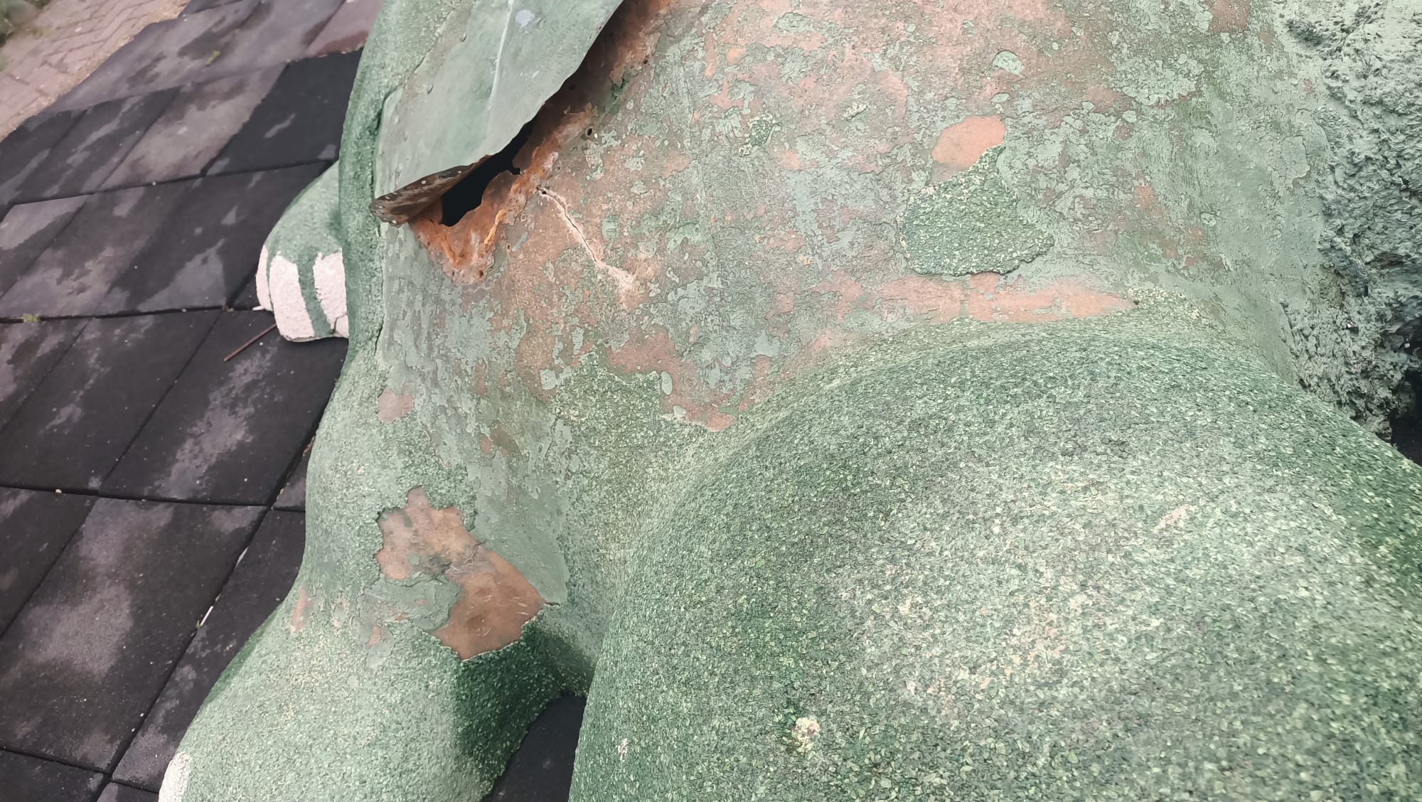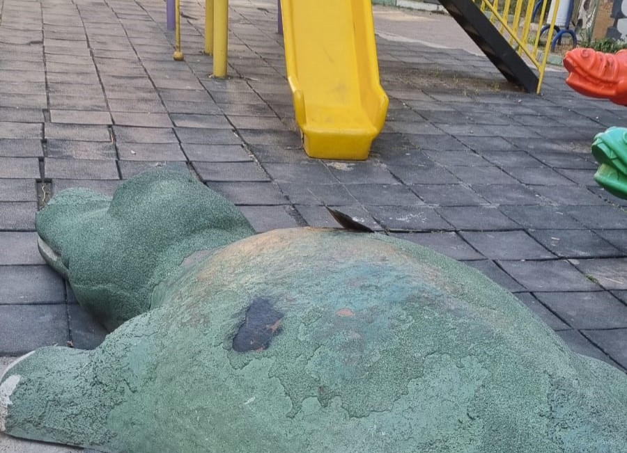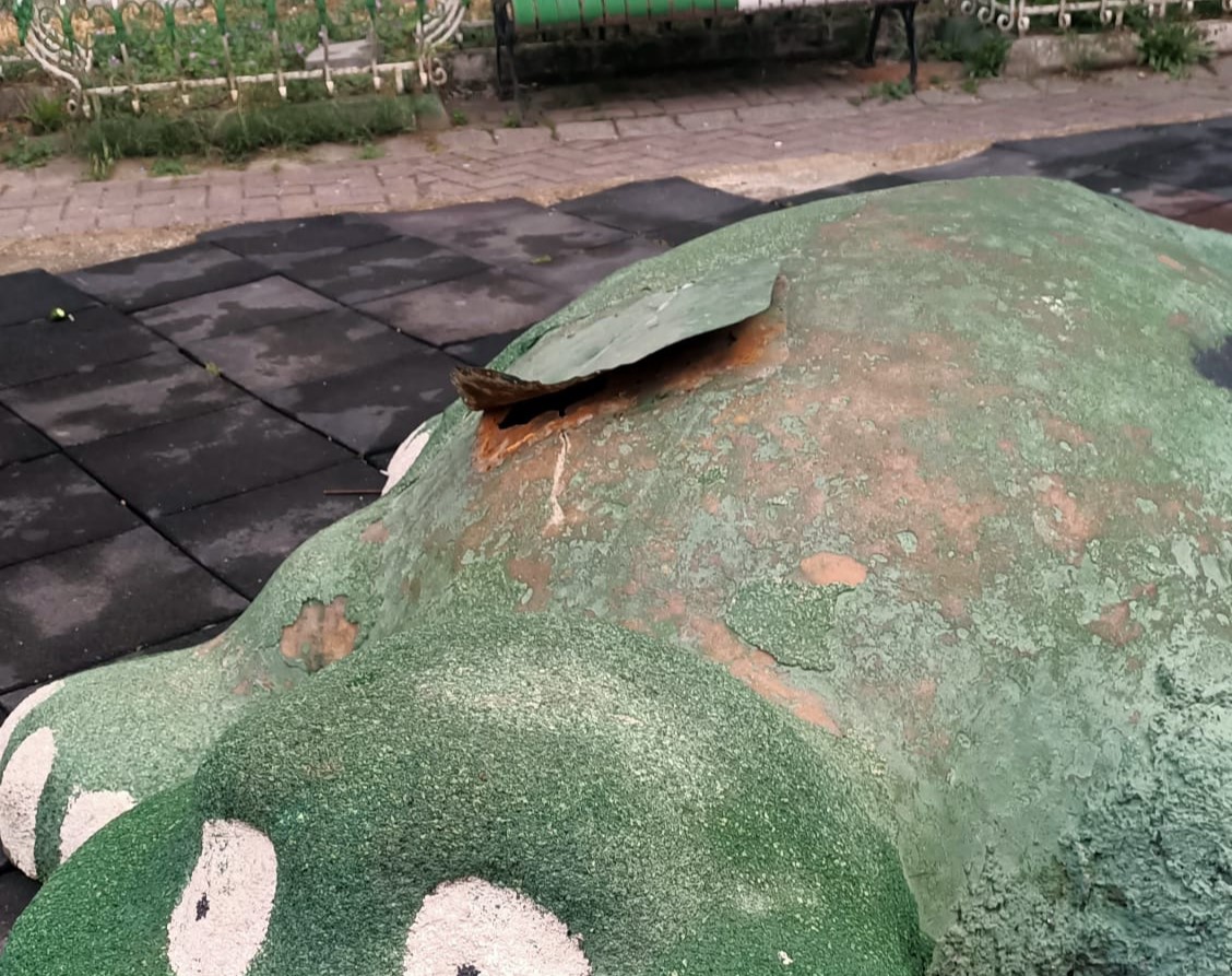 Orhangazi’de şehir merkezinde bulunan ve her gün onlarca çocuğun oyun oynamak için gittiği Bursaspor parkı içindeki timsah heykelinin üst kısmında oluşan yırtık tehlike yaratıyor.