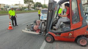 Yaklaşık 300 kilo ağırlığındaki kompresör yakınlardaki bir işyerinden çağrılan forklift yardımı ile yol ortasından alınarak kenara taşındı.