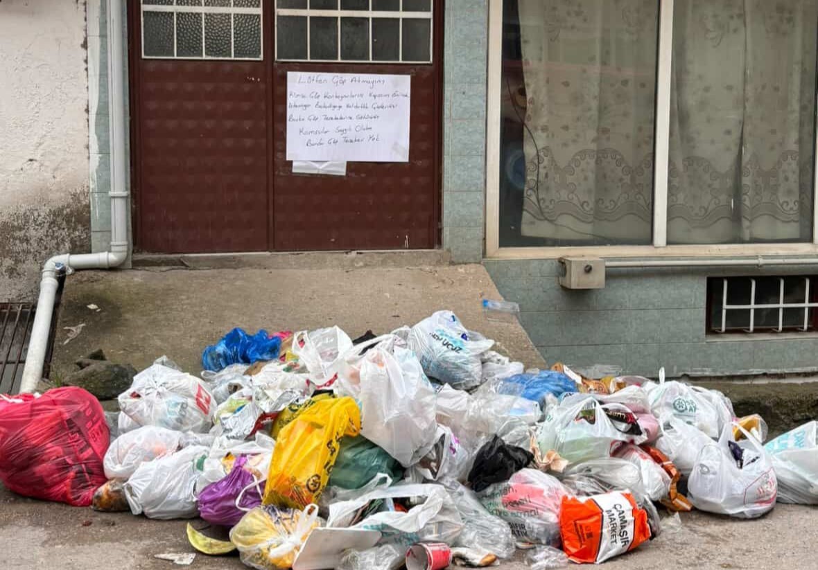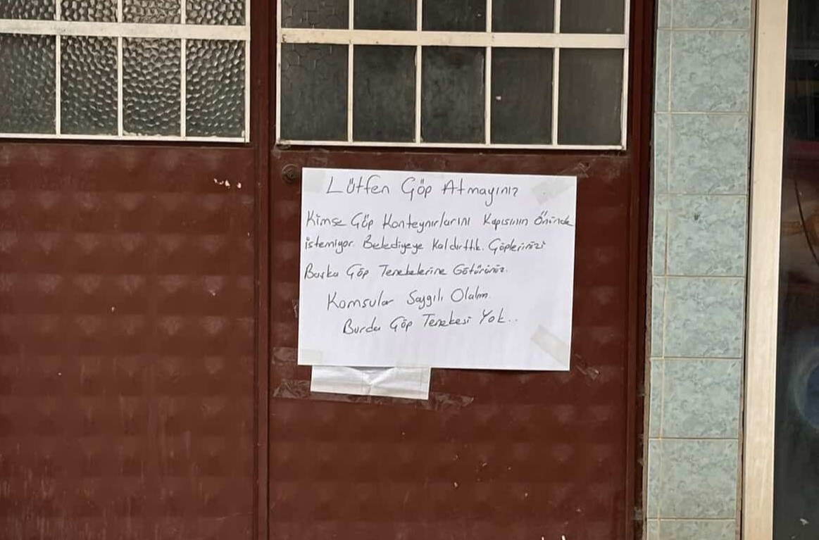 Sürekli olarak kapılarının önüne çöp kovası olmamasına rağmen, çöplerin bırakılmaya devam edildiğini gören bina sakinleri ise kapıya üzerinde ” Lütfen çöp atmayınız, kimse çöp konteynerlerini kapısının önüne istemiyor, Belediye’ye kaldırttık, çöplerinizi başka çöp tenekelerine götürün, komşular saygılı olalım, burda çöp tenekesi yok” yazan bir uyarı yazısı astılar.