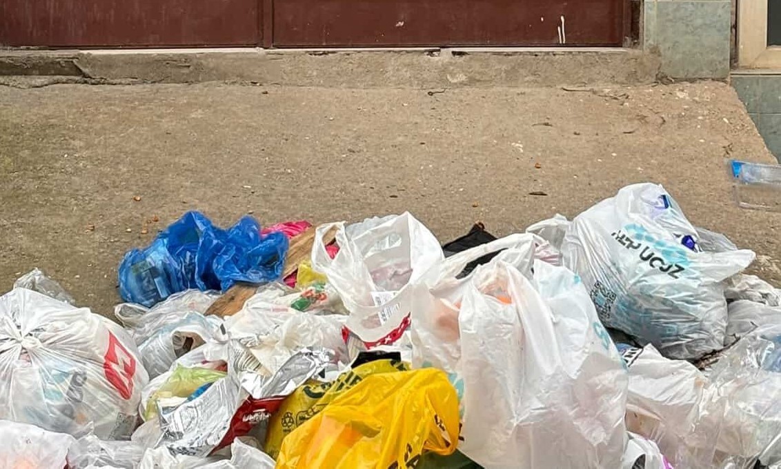 Astıkları yazıya rağmen çöplerin aynı noktaya bırakılmaya devam edildiğini gören bina sakinleri çöpleri, çöp kovası olmamasına rağmen bırakılmasına tepki gösterdiler.