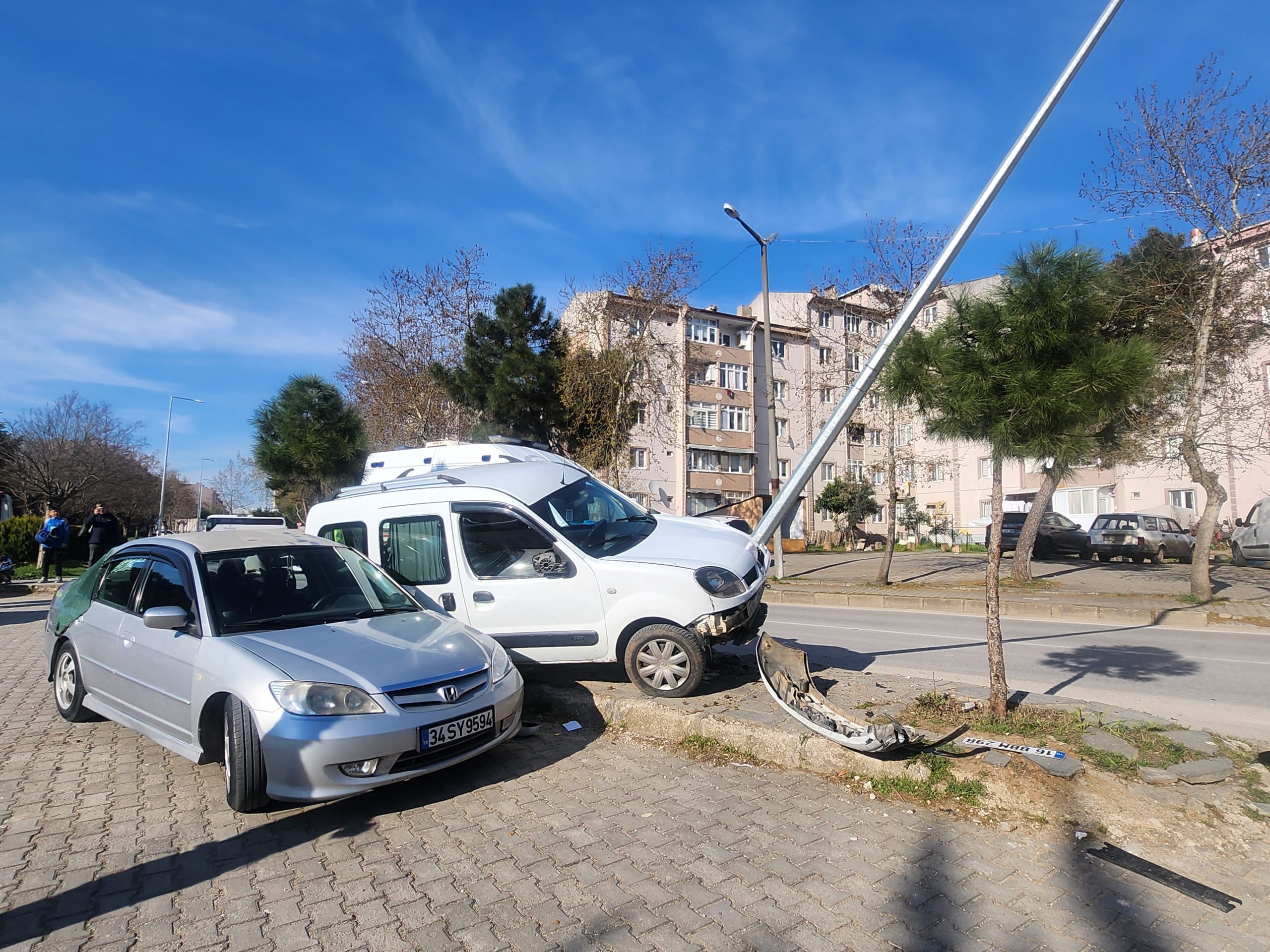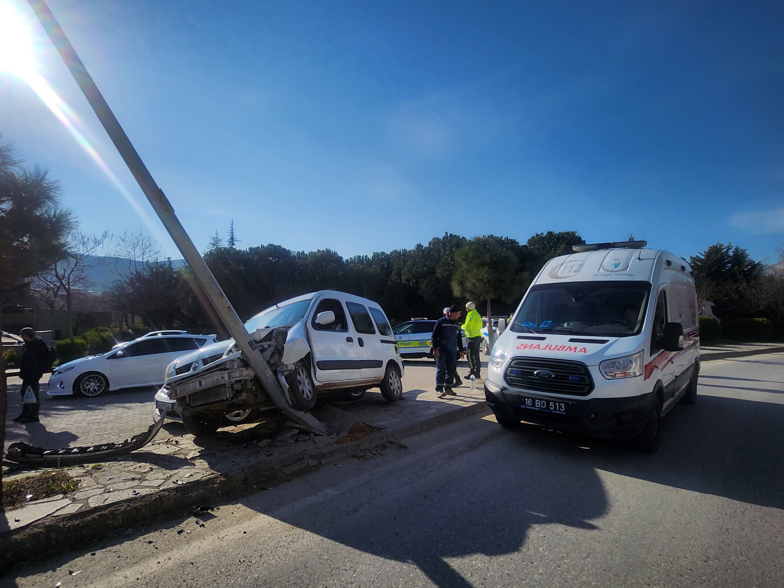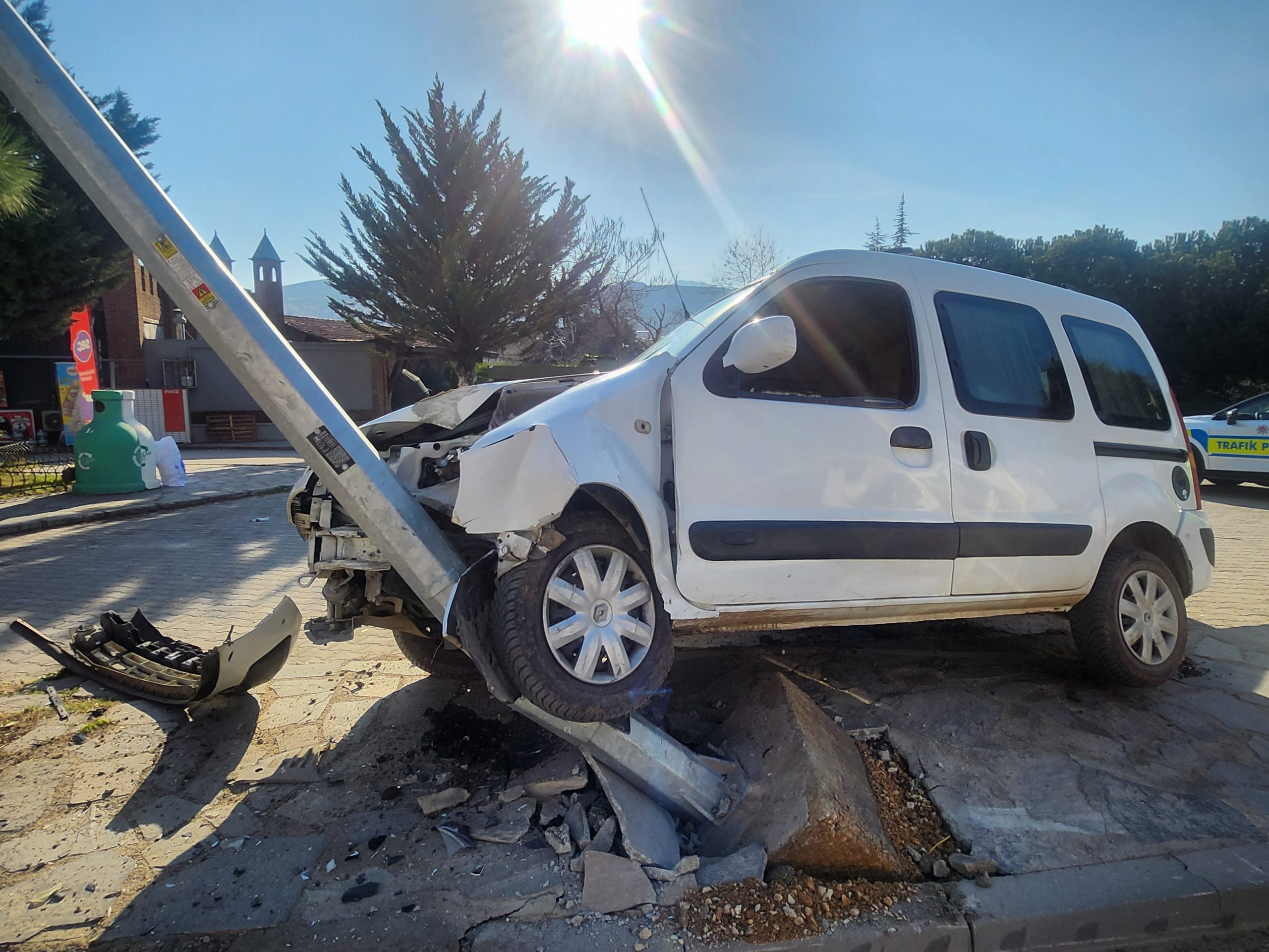 Kazaya karışan hafif ticari araçta, çarptığı aydınlatma direği ve otomobilde madde hasar meydana geldi.