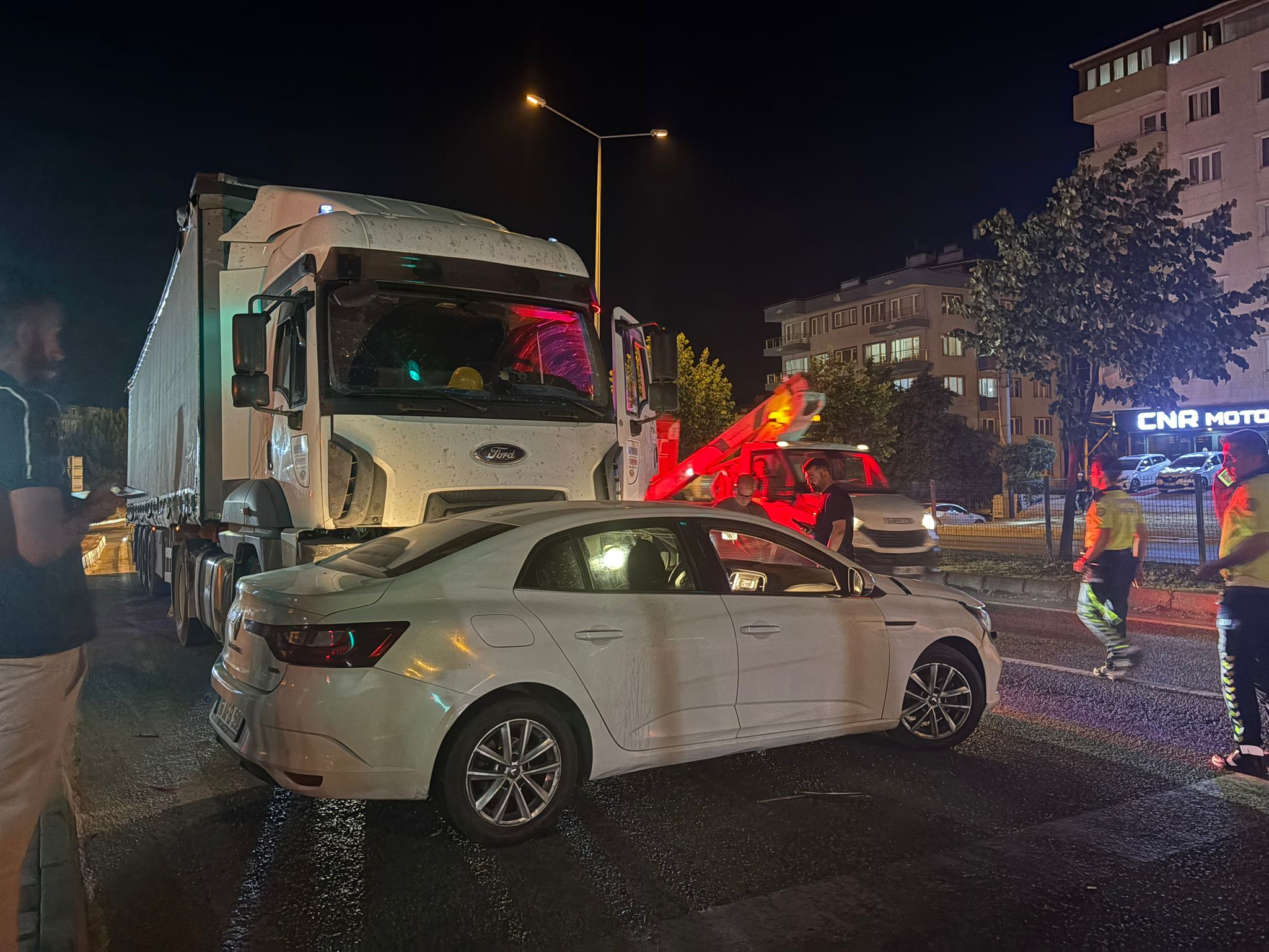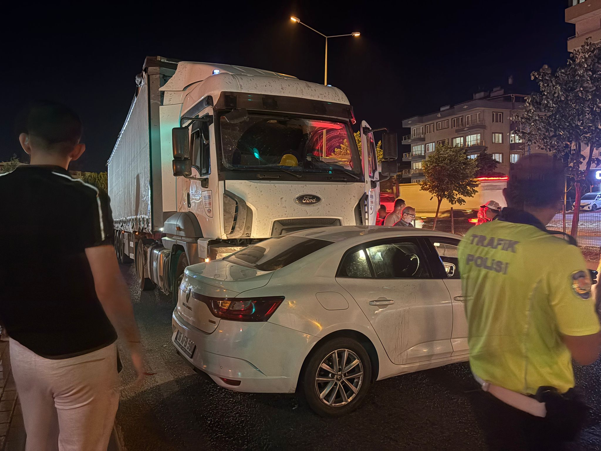 Çarpmanın etkisiyle savrulan otomobil, tırın önünde yan dönerek o şekilde kaldı.
