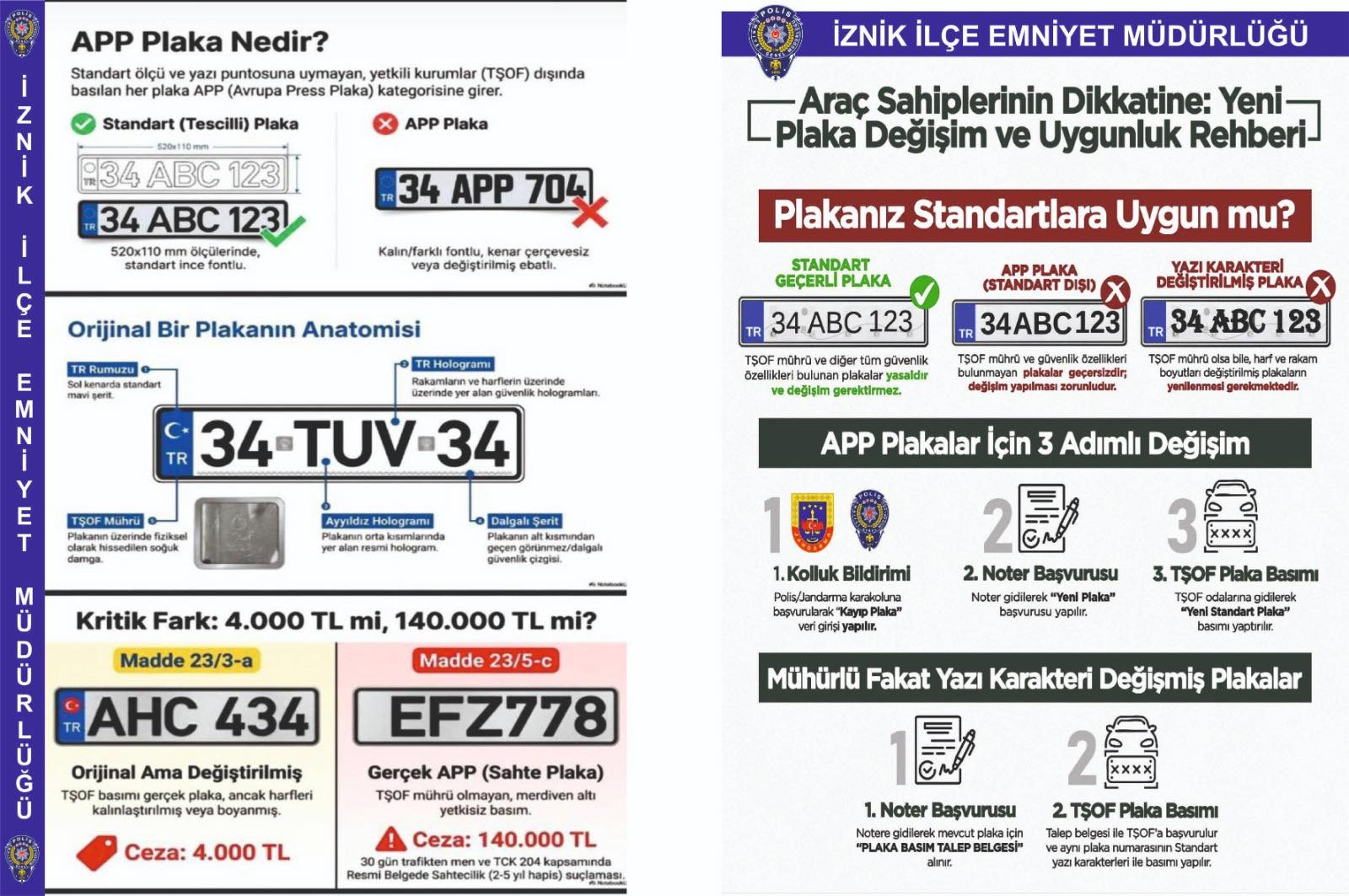 Ekipler tarafından yapılan uyarılarda, standart dışı olarak bilinen APP plakaların mevzuata aykırı olduğu hatırlatıldı. 1 Nisan itibarıyla yürürlüğe girecek düzenleme kapsamında bu plakaları kullanan sürücülere cezai işlem uygulanacağı belirtildi.