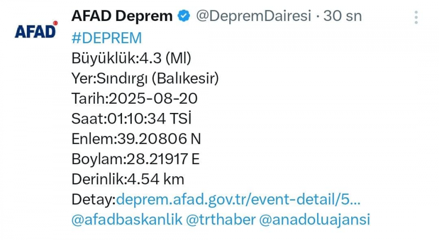 Balıkesir Sındırgı’da saat 01.10 itibariyle 4.3 büyüklüğünde bir depremin meydana geldiği açıklandı.