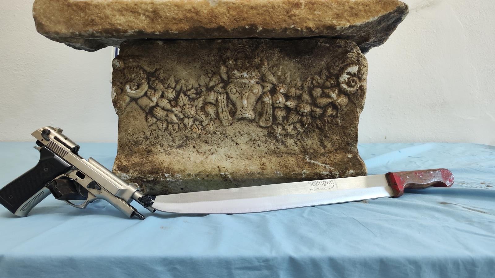 Yine aynı dönemlere ait olduğu değerlendirilen 1 adet tarihi obje,1 adet kurusıkı tabanca,1 adet bıçak ele geçirildi.