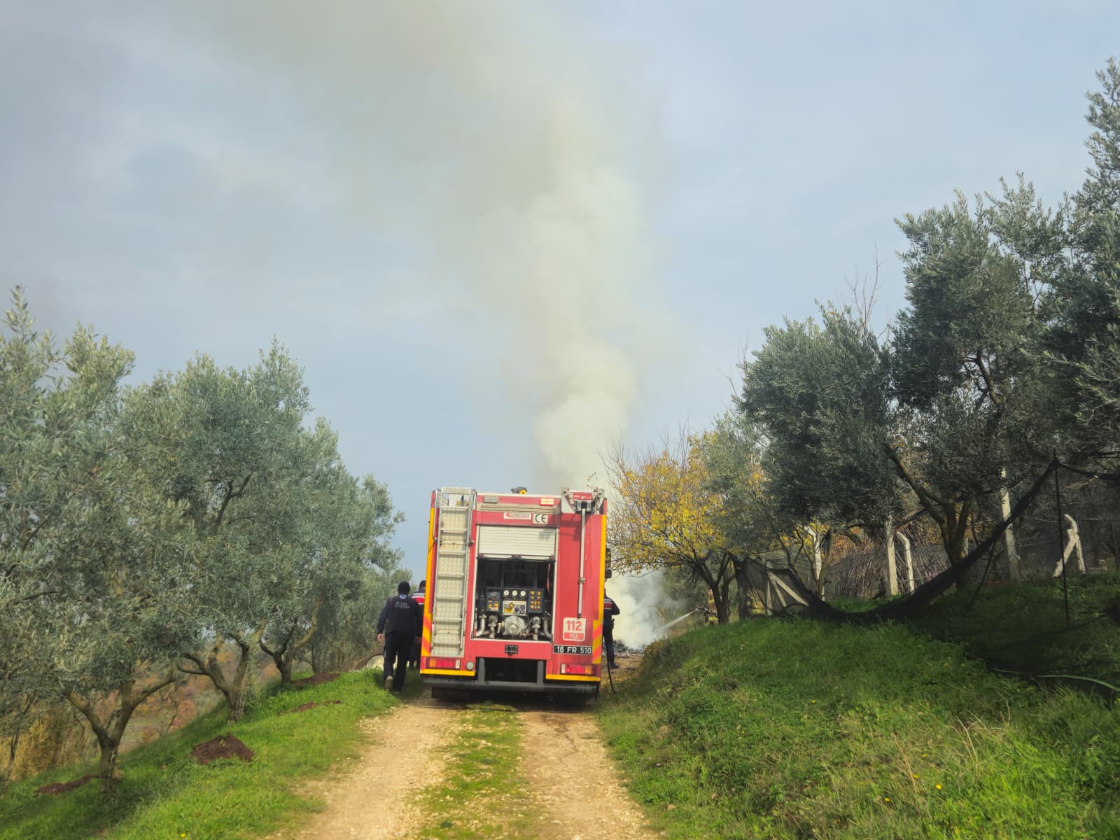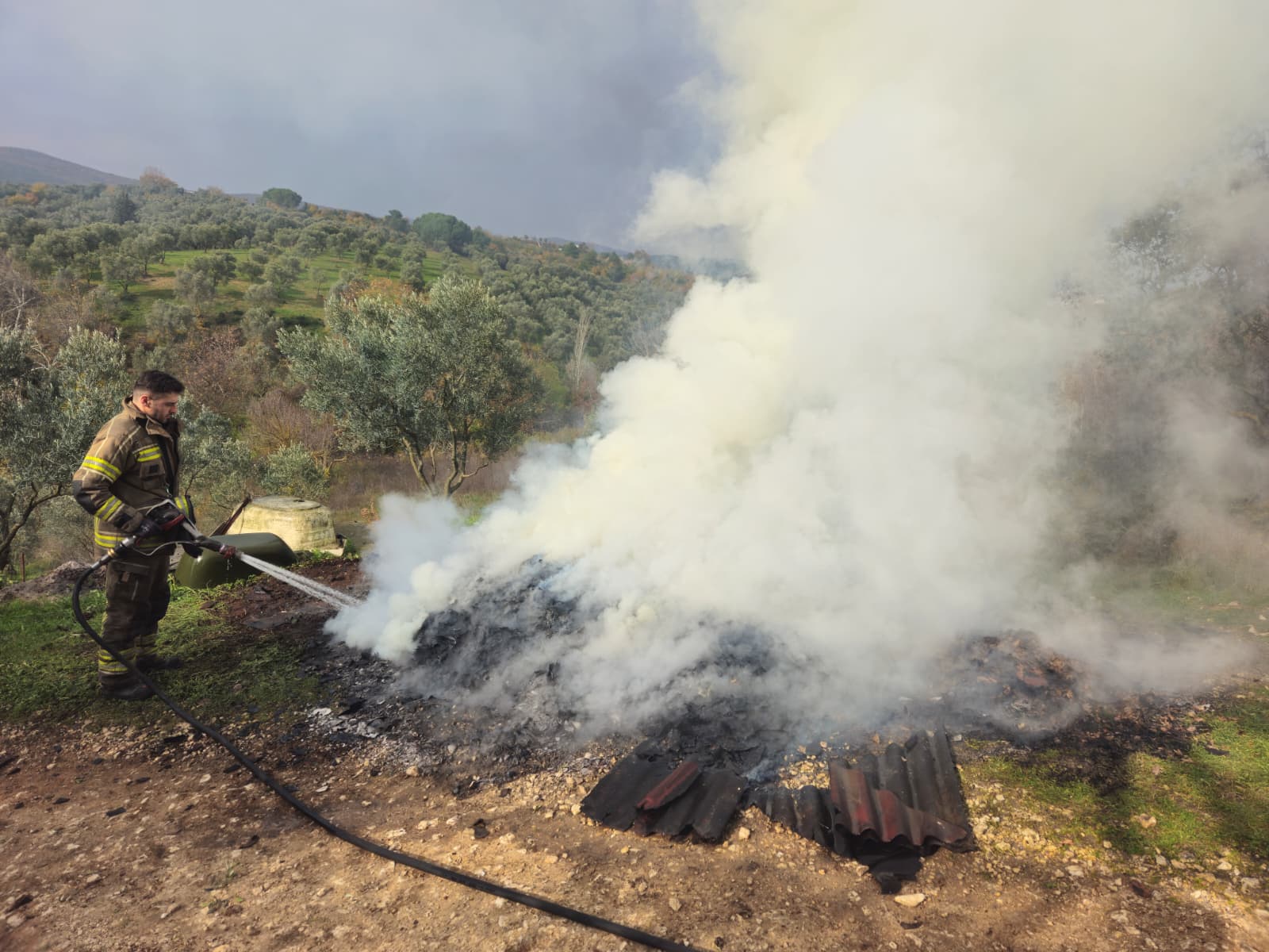 Yangın, Arapzade Mahallesi olukdere mevkiinde bulunan bir zeytin tarlası içindeki evin önünde meydana geldi.