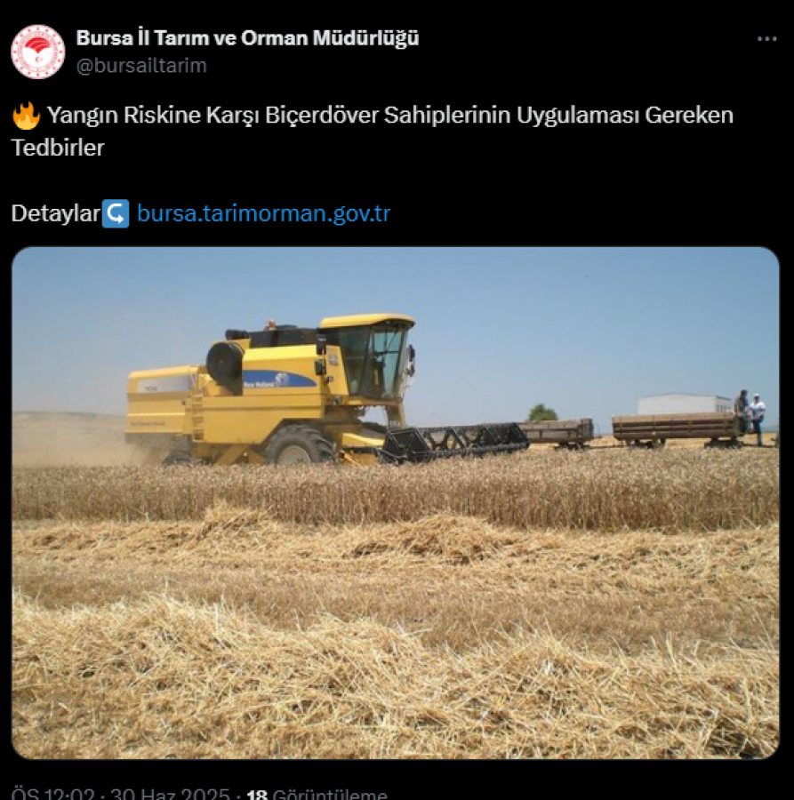 Bursa İl Tarım ve Orman Müdürlüğü, sosyal medya hesabından yangın riskine karşı biçerdöver sahiplerinin uygulaması gerektiği tedbirleri paylaştı.